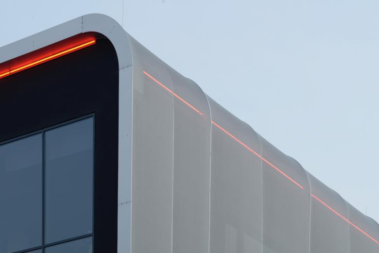 Auf dem Areal der ehemaligen Güterabfertigung Gütersloh wurde das städtebauliche Quartier Gleis 13 umgesetzt, das in vier Gebäuden neben Büroflächen ein Erlebniszentrum für Gastronomie, Sport und Fitness beheimatet. Im Haus IV wurde der Neubau eines Fitnessstudios realisiert, das durch seinen langgestreckten Baukörper, die metallische Fassadenoberfläche und die gebogene Wandung an Güterwaggons erinnert, die auf diesem Areal früher verkehrten. Als Membran für die Textilfassade wurde Frontside View 381 von Serge Ferrari ausgewählt, das die Architekten durch seine kreativen Gestaltungsoptionen sowie die Wandlungsfähigkeit unter verschiedenen Beleuchtungsaspekten überzeugte.