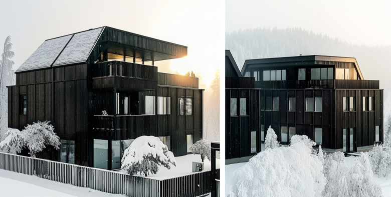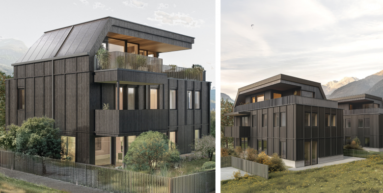 Drei elegante Stadtland-Villen vereinen urbanen Luxus mit ländlicher Idylle. Ihr markantes Erscheinungsbild – ein kraftvoller Betonsockel in Kombination mit einer dunklen Holzfassade – verkörpert die Symbiose aus klassischer Eleganz und einer modernen Interpretation traditioneller Baukunst. Der nachhaltige Holzbau und die individuellen Wärmepumpen jeder Wohnung unterstreichen das Konzept von Autonomie und ökologischer Verantwortung.