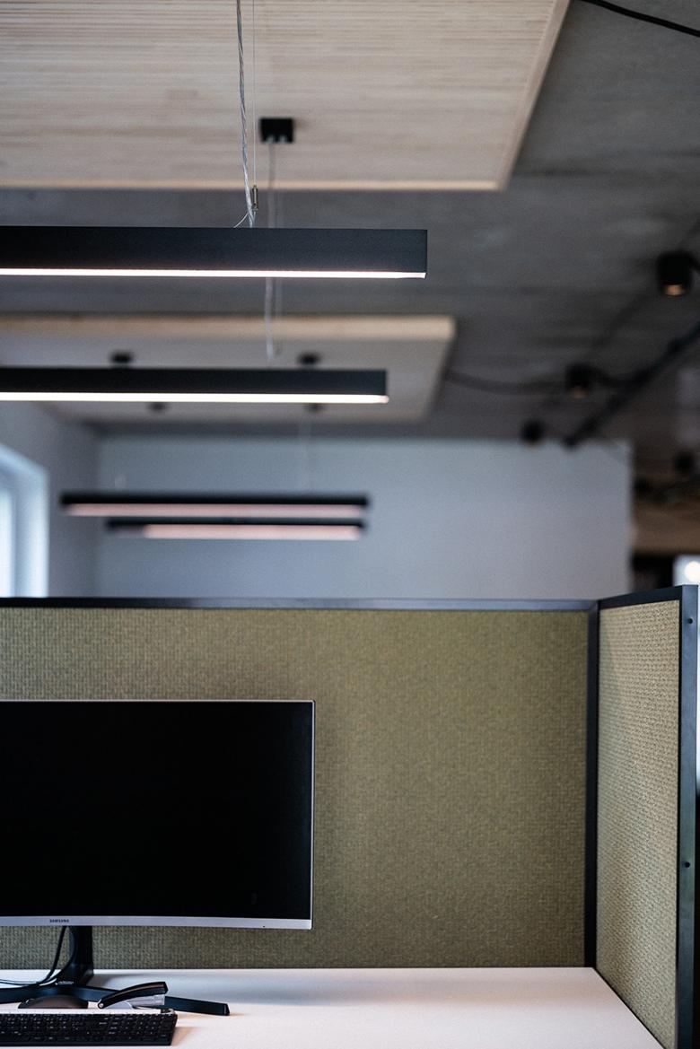 Für optimale Arbeitsbedingungen wurde ein individuelles Beleuchtungskonzept entwickelt, welches einerseits funktional ist und andererseits besondere Merkmale des Büros hervorhebt. Teil dieses Konzepts sind Up and Down Lights bei den Arbeitsplätzen, die sowohl zur perfekten Ausleuchtung des Arbeitsplatzes dienen als auch das Licht nach oben strahlen, um die Umgebung an die Lichtverhältnisse anzupassen. Die Lichtfarbe wurde optimal abgestimmt, um eine angenehme Arbeitsatmosphäre zu schaffen. Diese gezielte Beleuchtung zeigt eindrucksvoll, welche Rolle Licht bei der Gestaltung eines Raumes spielt und welche vielfältigen Möglichkeiten es gibt, Leuchten in die Raumgestaltung einzubeziehen.