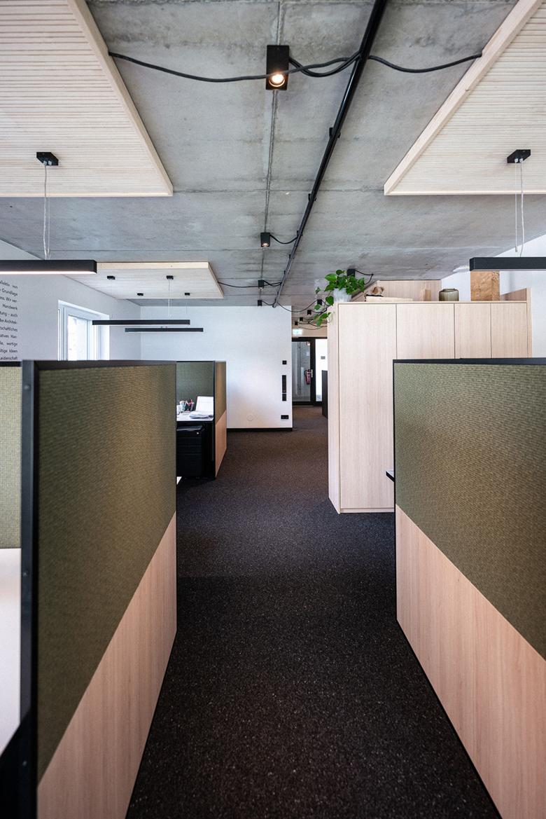 Das offene Bürokonzept wurde sorgfältig geplant, um eine optimale Arbeitsumgebung zu schaffen. Neben einem großzügigen Besprechungsraum und einem Einzelbüro umfasst es sechs kleinere Arbeitskojen. Diese bieten den Mitarbeitenden eine ideale Balance zwischen Privatsphäre und ungehindertem Arbeiten, und der Kommunikation und dem Austausch untereinander. Die individuellen Arbeitsbereiche sind geschickt in den Raum integriert und bieten vielfältige Gestaltungsmöglichkeiten.