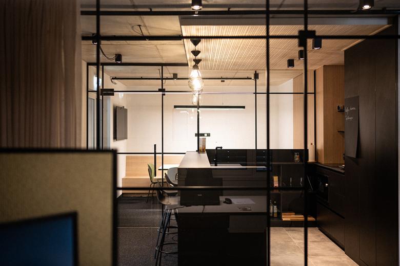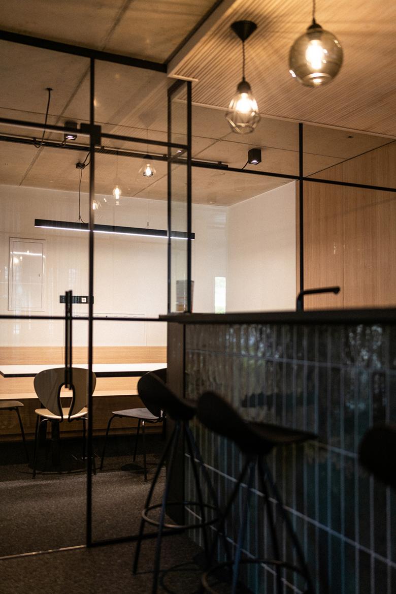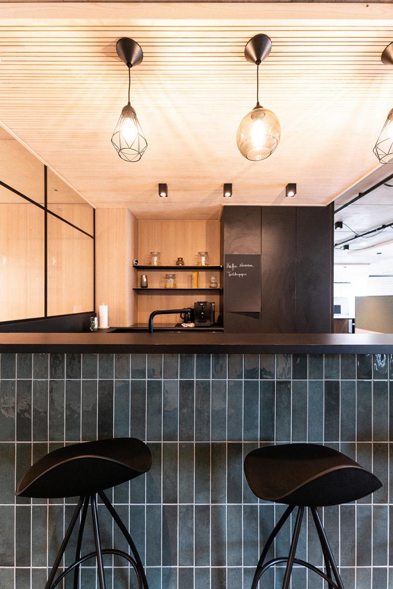 Als zentraler Treffpunkt dient der offene Küchenbereich mit einer Bar und komfortablen Sitzgelegenheiten. Hier haben die Teammitglieder die Möglichkeit sich auszutauschen und bei einer gemeinsamen Mittagspause zu entspannen. Die Terrasse und der angrenzende Garten erweitern den Raum nach draußen und bieten eine angenehme Umgebung für erholsame Pausen.