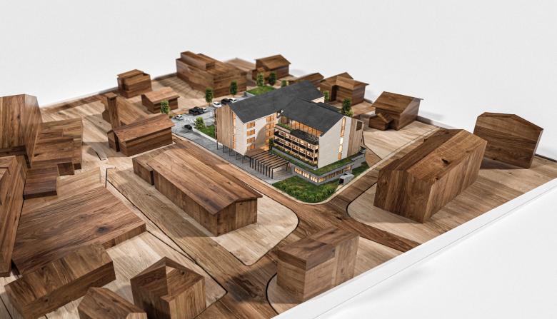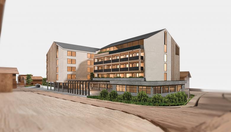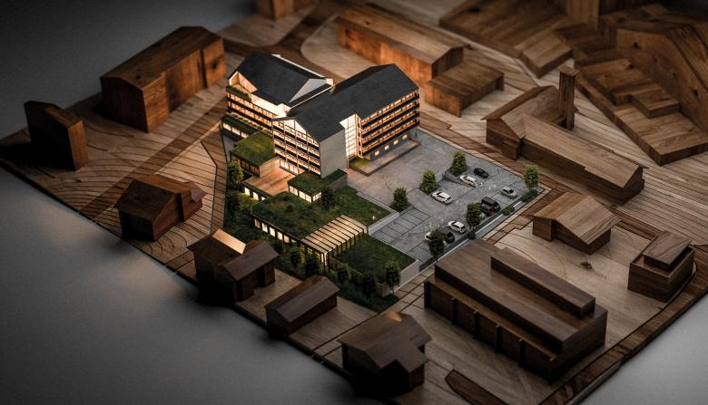Der Leitsatz des Planungsprozesses lautete demnach „Ruhe durch Reduktion“. Im ersten Schritt wurden die unterschiedlichen Dachvorsprünge auf eine Ebene gebracht und die Gebäudekörper von drei auf zwei reduziert. Als Gestaltungsansatz für die Fassade diente das traditionsreiche Montafoner Haus. Durch Verwendung ursprünglicher Materialien und ein geradliniges Design entstand so eine Hommage an die charakteristische Optik dieser Bauart. Besonders reizvoll ist hier der Kontrast zwischen der modernen Holzverkleidung und dem klassischen weißen Putz. Einschnitte in den Gebäudekörper und großzügige Verglasungen lockern die Struktur auf und sorgen für zusätzlichen Lichteinfall wodurch der Kern des Hotels, in dem sich die Rezeption befindet, trotz bestehender niedriger Deckenhöhe groß, hell und offen erscheint. Es wurde zudem darauf geachtet die Wege innerhalb des Hotels zu verkürzen und übersichtlicher zu gestalten. Ein Einschnitt im Dach soll den Blick auf die hinter dem Hotel liegende Bergspitze freilegen und so die umliegende Natur mehr in den Fokus zu rücken. Die Längsseiten des Hotels werden mit Balkonen bestückt und an der Südseite entstehen exklusive Maisonette Zimmer um die Wirkung dieser Himmelsrichtung und entsprechenden Lichteinfall optimal zu nutzen.