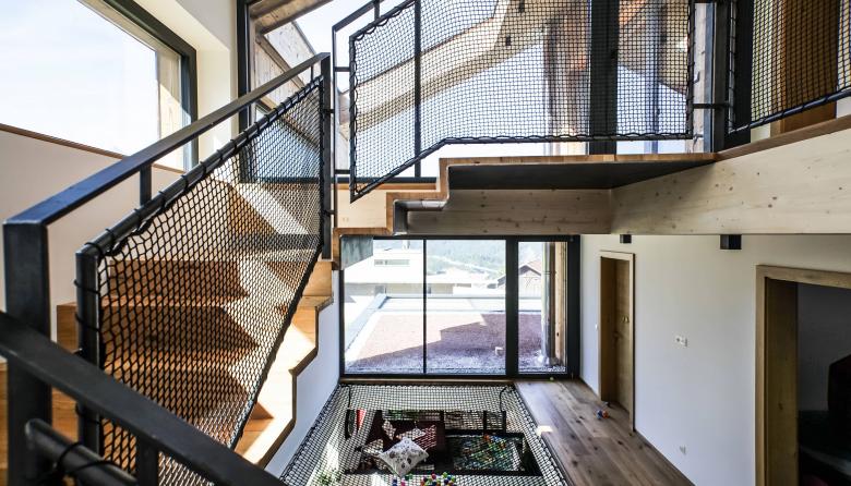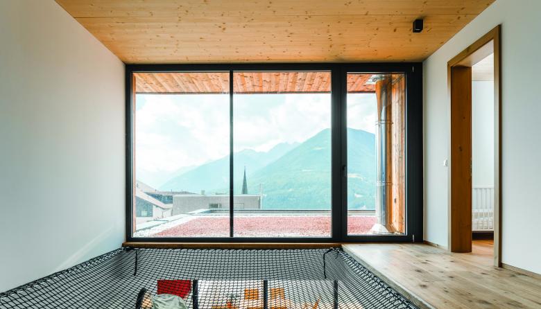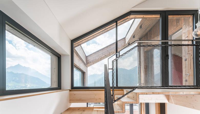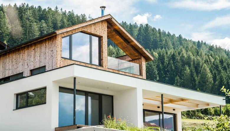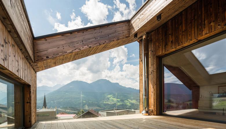 Die Fassadengestaltung des Einfamilienhauses zeichnet sich durch die Ausrichtung der Fenster aus, welche an die Ausblicke auf die umliegende Berglandschaft angepasst ist. Das Haus spiegelt dadurch eine Transparenz wieder, was der Idee eines offenen Lebensstils und einem gefühlvollen Umgang mit der Natur nahekommt. Im Herzen des Hauses werden alle Stockwerke durch eine offene Deckenkonstruktion miteinander verbunden, was im Innenraum ein Atrium entstehen lässt.