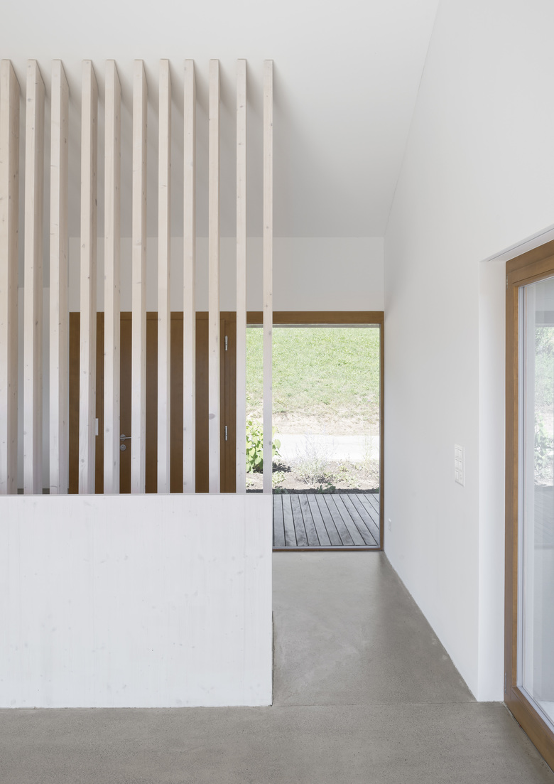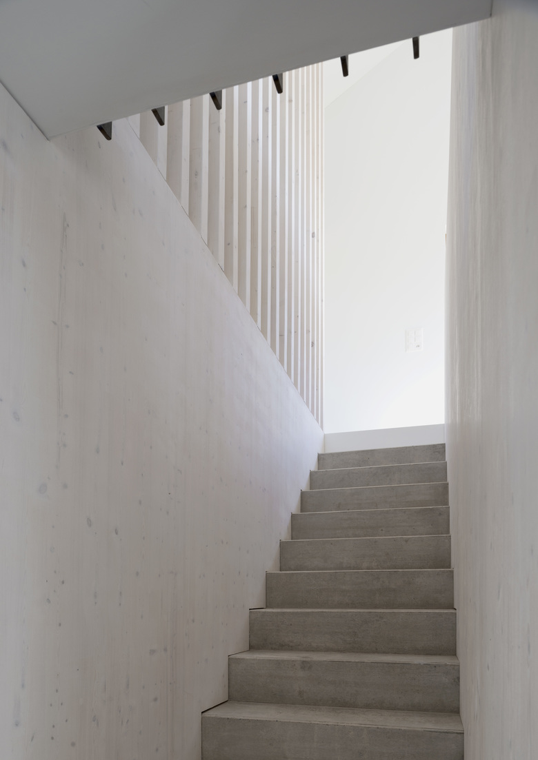 Der Wohnbau ist als ein Raum mit Dach und mittigem Kern, welcher Wohn- und Essraum/Küche räumlich gliedert, ausgebildet. Durch einen raumhohen Holzfilter entlang des Treppenabgangs wird das Entree zusätzlich räumlich definiert. An der nordseitigen Innenwand verläuft eine Betonbank über die ganze Raumlänge, sie bietet im Entree Sitzmöglichkeit und wird zum Wohnraum hin, zur Ofenbank mit Feuerstelle. Über eine einläufige Treppe wird das darunterliegende Zimmergeschoss, mit zwei Individualzimmern und dazugehörigem Nassraum, sowie hangseitigen Keller- und Technikräumen, erschlossen. Der Garagenbau bietet im oberen Geschoss Platz für zwei Autos, im darunterliegenden Geschoss einen Raum für Gartengeräte.