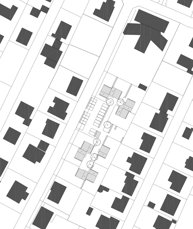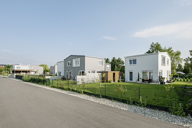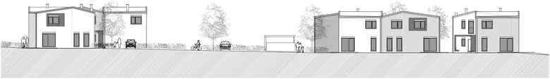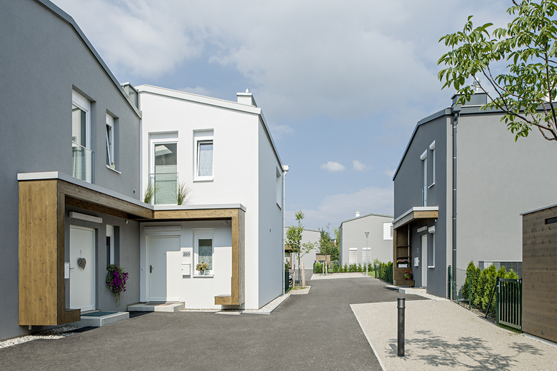9 Häuser auf einem Grundstück im von Einfamilienhäusern bestimmten Gebiet von Kottingbrunn könnten einfach nebeneinander aufgereiht werden, im Süden also straßenseitig das Auto, im Norden der Garten. Oder man könnte jeweils zwei Häuser zusammenfassen, zueinander versetzen, um einen kleinen Hof gruppieren, diesen als Vorbereich und als Treffpunkt nutzen und so halböffentliche Wohnzonen und private Bereiche entstehen lassen.