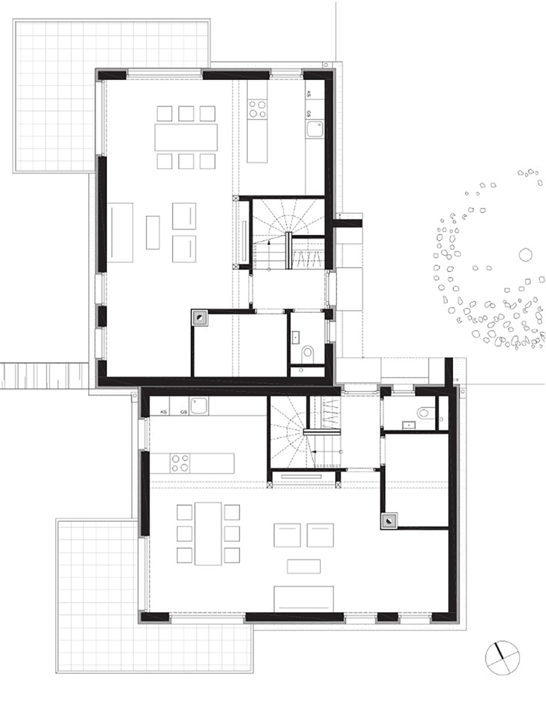 Die kleinen Höfe der beiden Häusergruppen werden miteinander verbunden und entwicklen gemeinsam einen dörflichen Charakter, man kann vor seinem Haus auf dem Vordach-Sitzbank-Element sitzen, tratschen,und den Kindern beim Spielen zu sehen. Jedes Haus hat so auch seine eigene besondere Position am Grundstück, Sonne von 3 Seiten, verschiedenste Gartengrößen und -ausrichtungen, sozusagen für jede Vorliebe das Passende und natürlich Privatsphäre, da die Häuser 90° zueinander gedreht sind.