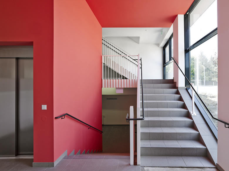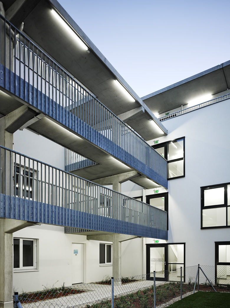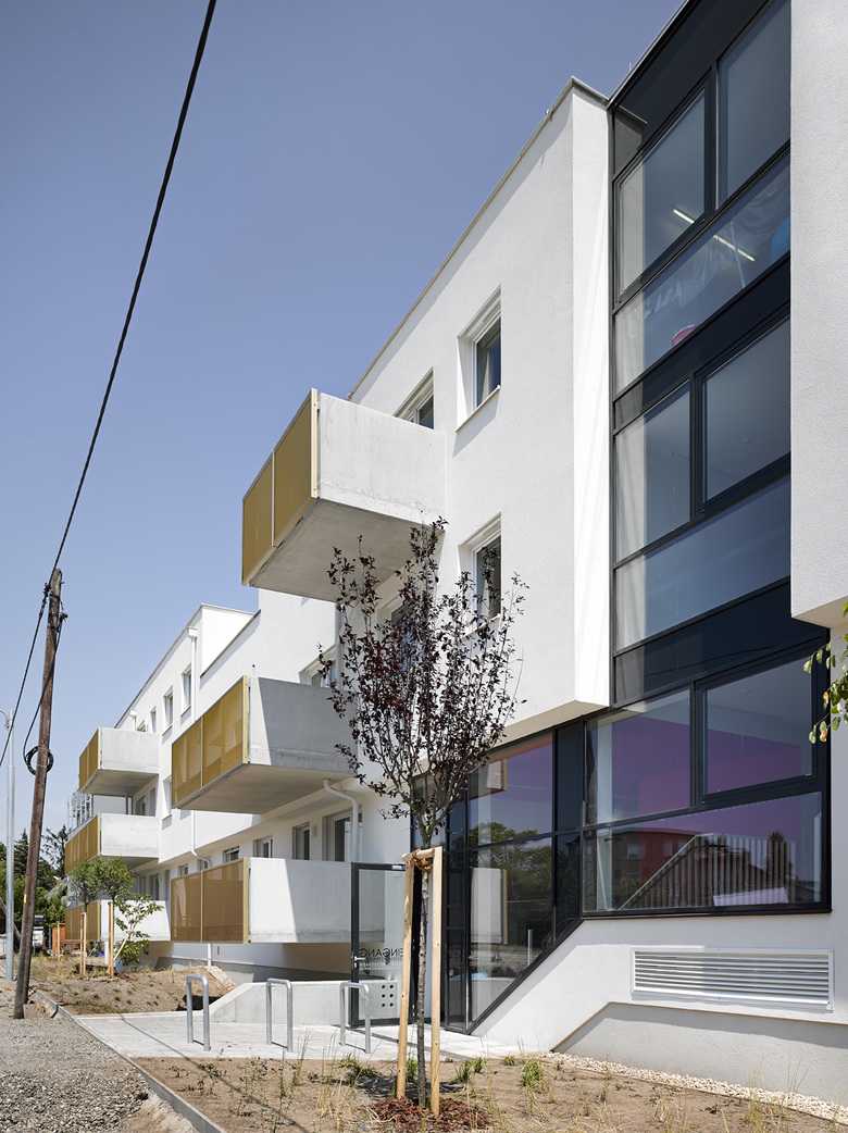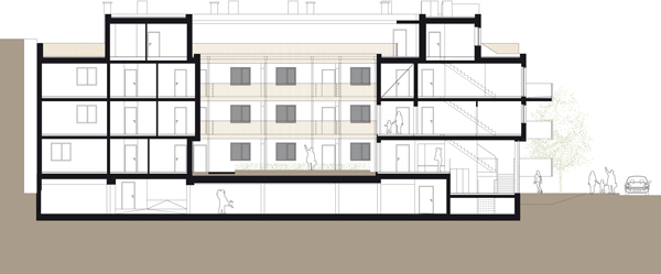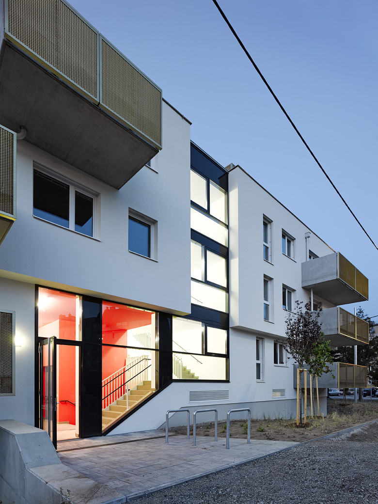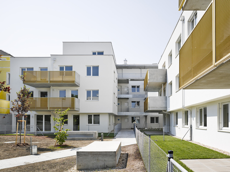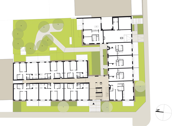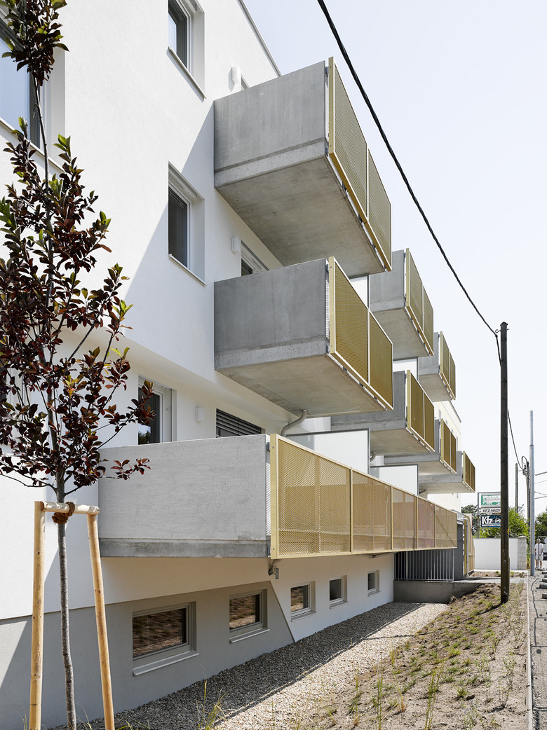 In städtischer Weise schließt die Bebauung des nach Süden und Westen ausgerichteten Eckgrundstücks in Wien Floridsdorf entlang der beiden Straßen den Blockrand, weist aber eine nicht allzu hohe Höhe auf. Verglaster Eingang und Stiegenhaus bilden die optische Trennung zwischen den beiden Gebäuderiegeln, die einerseits über einen Mittelgang erschlossene einseitig belichtete 3-Zimmer-Wohnungen nach Westen und Osten bieten und andererseits Nord-Süd orientierte, durchgesteckte über einen Laubengang begehbare 2-Zimmer-Wohnungen. Um den Aushub zu reduzieren graben wir die Stellplätze nur etwa eineinhalb Meter ein. Der Zugang zum Haus erfolgt daher im Halbgeschoß und führt über eine kurze Treppe ins eigentliche Erdgeschoß und von dort in den auf gleicher Ebene liegenden begrünten Innenhof. Der klar strukturierte Baukörper mit zusammengefaßten Erkern betont die Gebäudeecke und bietet einen ruhigen Hintergrund für die Nutzung der Freiräume (Balkone) und den 5 m tiefen und dadurch sehr gut gestaltbaren Vorgarten.