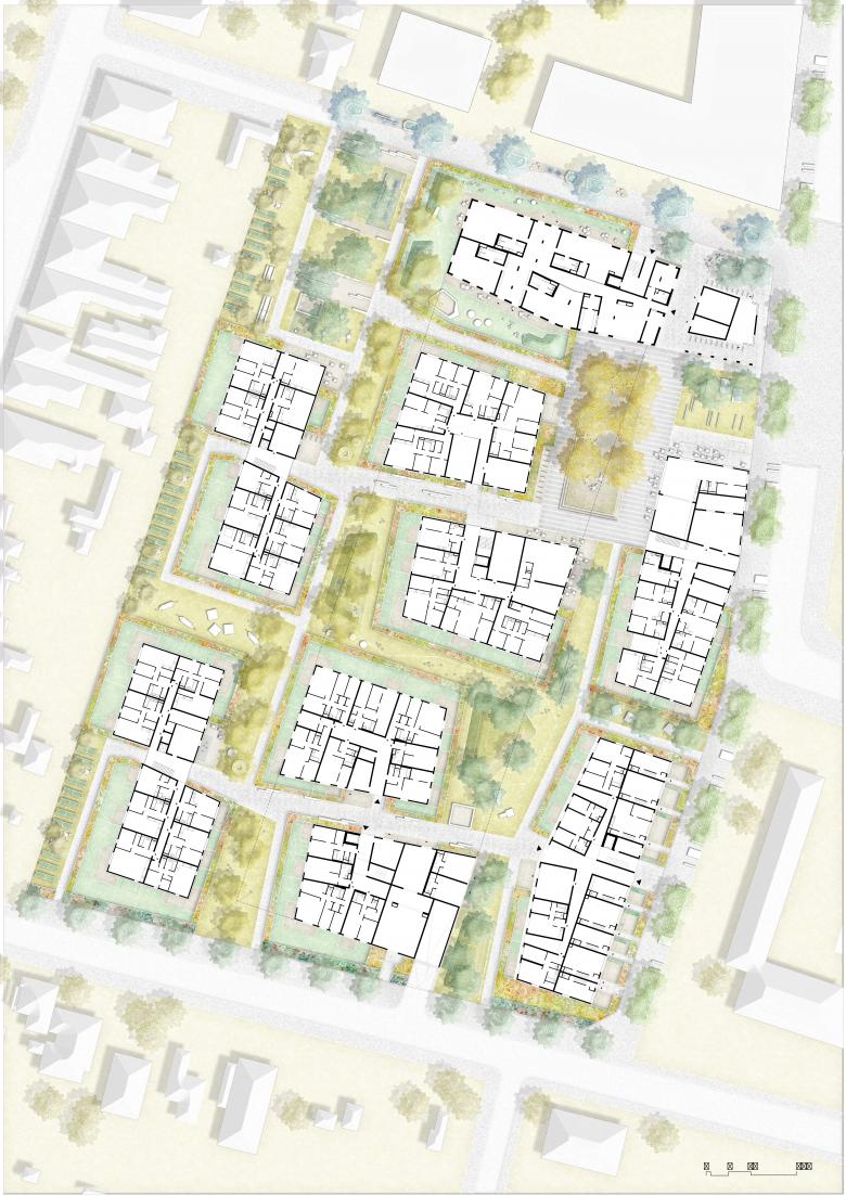 Das Quartier wird in drei Wohnatmosphären gegliedert: Stadthäuser, große Schmetterlinge und kleine Schmetterlinge. Die Stadthausriegel bilden im Norden und Osten eine Kante zur angrenzenden Straße, deren Wirkung durch eine horizontale Gliederung der Fassade weiter verstärkt wird. Die zentralen, großen Schmetterlinge, sind durch begrünte Brücken miteinander verbunden – der Name kommt von der flügelähnlichen Form des Umrisses. Durch die sich an den Brücken befindenden Gemeinschaftsräume und den Versatz der verbundenen Baukörper zueinander, bleibt viel Platz für helle Eckwohnungen mit freier Aussicht auf die Umgebung. Die am westlichen Rand liegenden kleinen Schmetterlinge, bilden durch eine geringere Höhe und kleinere Fläche den Anschluss an die angrenzenden Einfamilienhäuser und schaffen somit Synergie zwischen Bestand und Neubau.