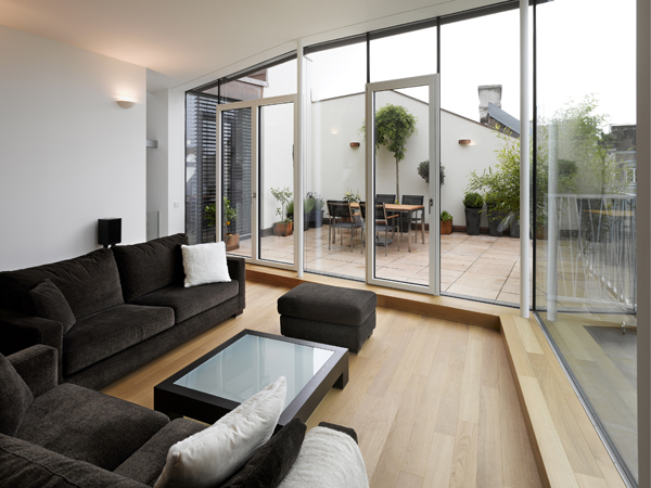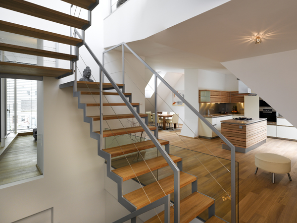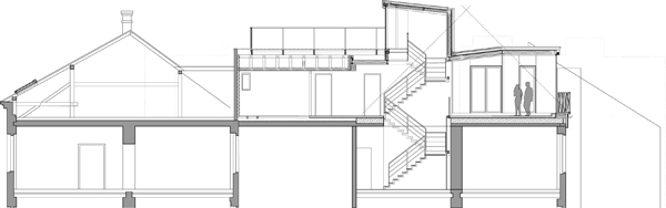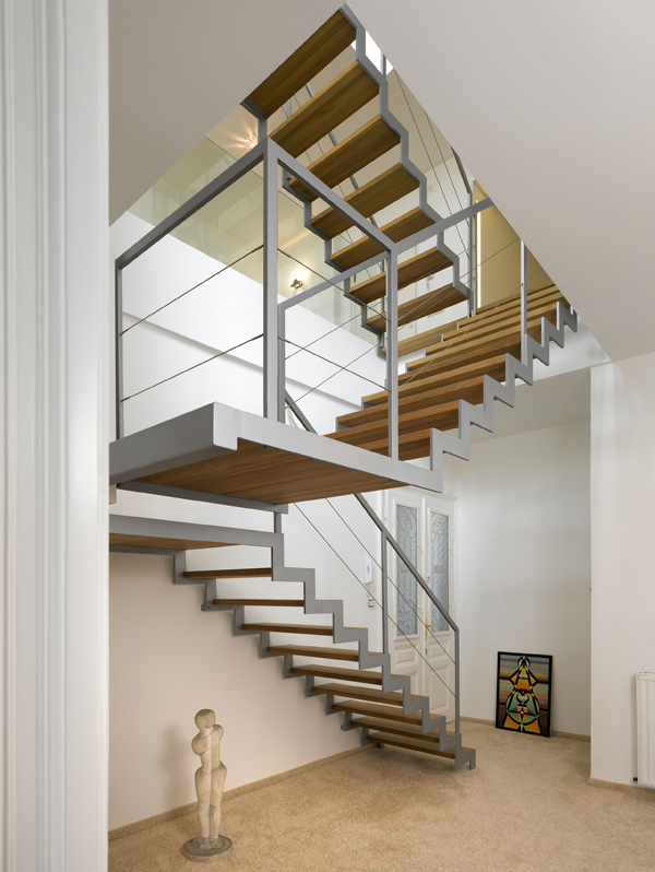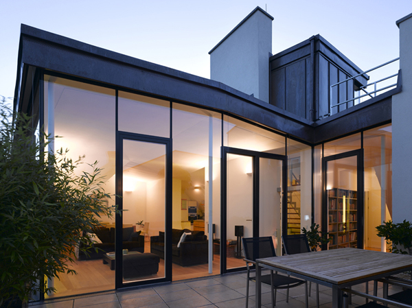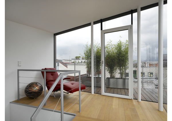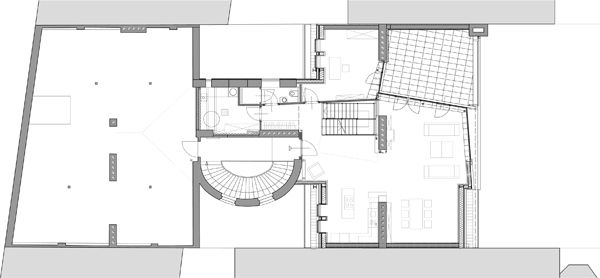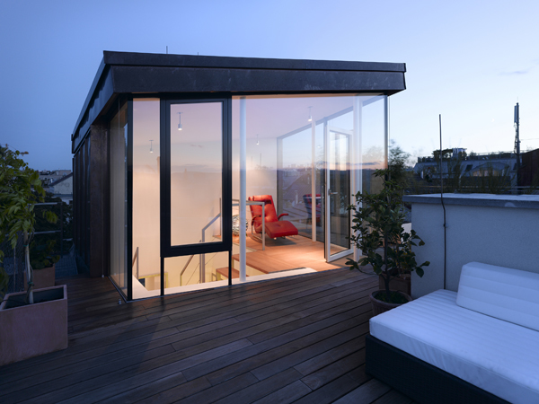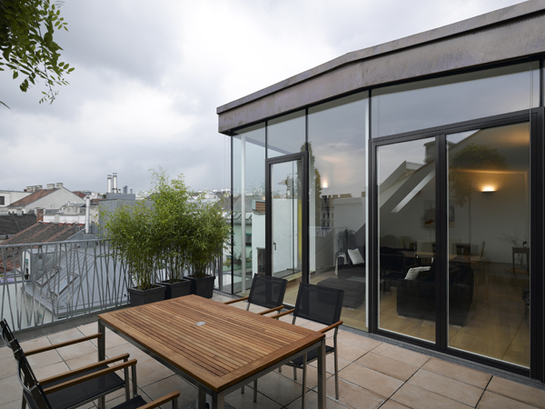 Beschränkungen der Bauordnung im dicht bebauten Gebiet belassen nur geringe Spielräume für die Planung eines Dachbodenausbaus. Und doch ist aus einem relativ kleinen Dachraum am Südtrakt eines Jugendstilhauses ein luftiger Wohnraum mit viel Licht und gerichteten Ausblick entstanden. Die Positionierung der Glasflächen lenkt die Blicke zum grün des Innenhofs und zur Weite Richtung Kahlenberg, die sich dem Besucher im Ausgang auf die obere Terrasse in seiner vollen Weite zeigt.