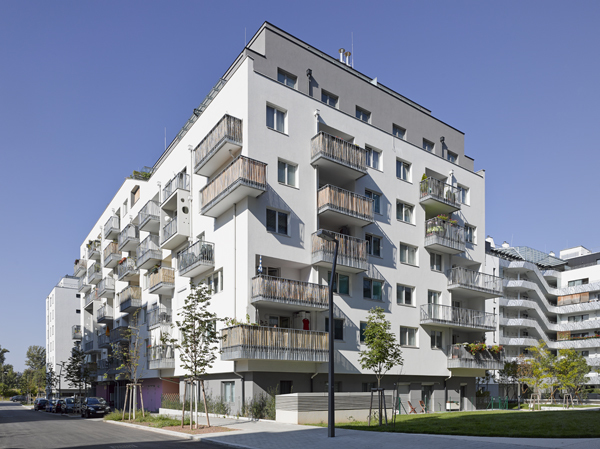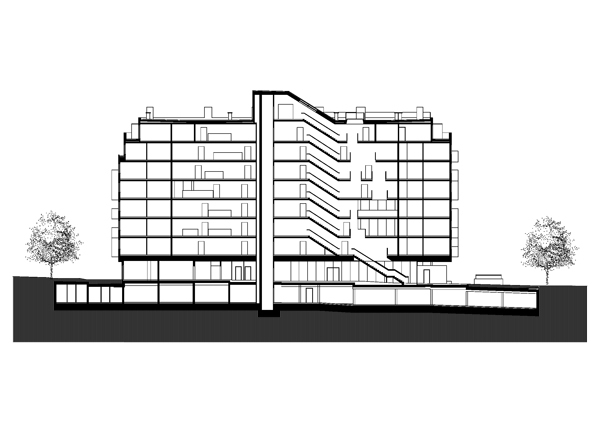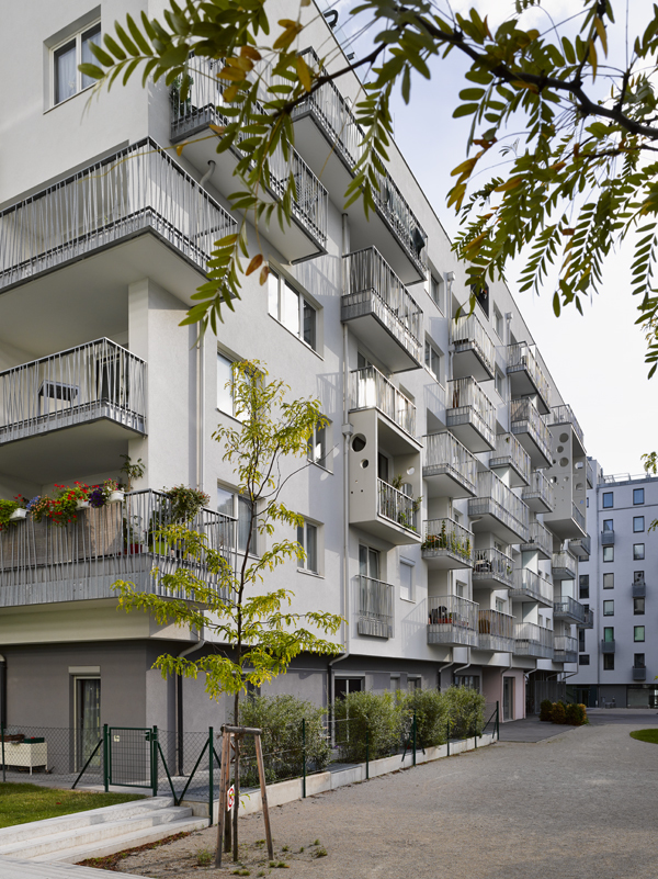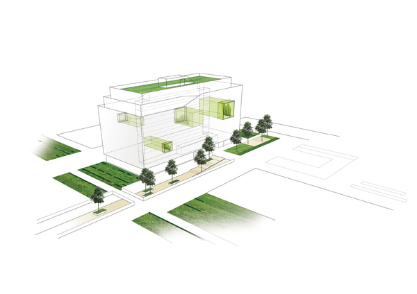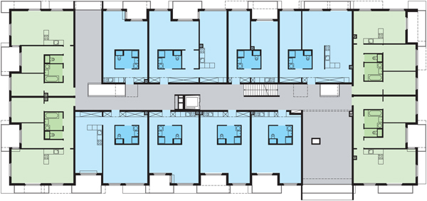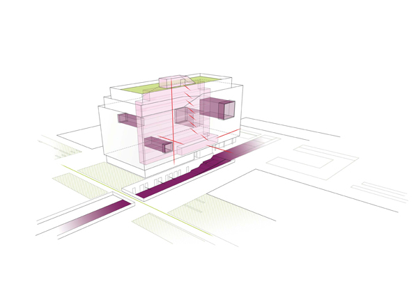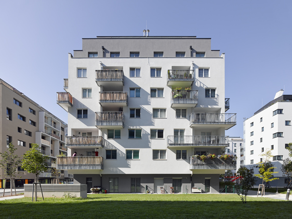 Wohnbau für junge Menschen muss unserer Meinung nach 3 Punkte erfüllen: er muss leistbar sein, flexibel auf geänderte Lebenssituationen reagieren können und großzügige Bereiche zur Kommunikation im innen- sowie Außenbereich bieten. Aufgrund der großen Trakttiefe schlagen wir an den langen Seiten der Blöcke einseitig belichtete Minimal-Wohnungen vor, die über eine großzügige Mittelgangerschließung (Kommunikationszone) angebunden werden - an den kurzen Seiten sehen wir zweiseitig über Eck belichtete Familienwohnungen vor. die Minimal-Wohnungen sind mit einer „intellegenten Wand“ zum gang ausgestattet, die Küche und Schrankbereich abdeckt. Die als Ein- oder Zweiraumwohnungen funktionierenden Wohnungen sind durch einen Funktionsblock (WC, Bad) gegliedert, um den sich gleichwertige Räume anordnen. Diese Räume können je nach Bedarf getrennt (Schrank, Vorhang, Leichtbauwand) werden und ändern sich so zu Zwei- bzw. Dreizimmerwohnungen, dabei sind aber alle Räume immer über den Vorraum begehbar.