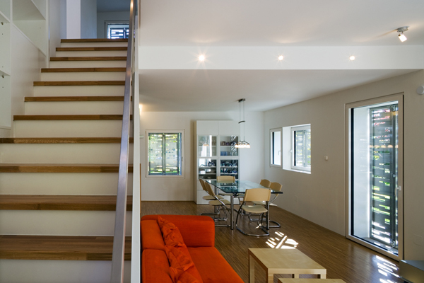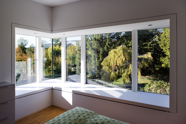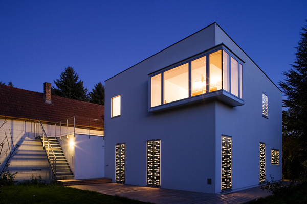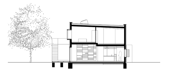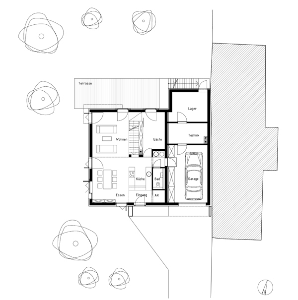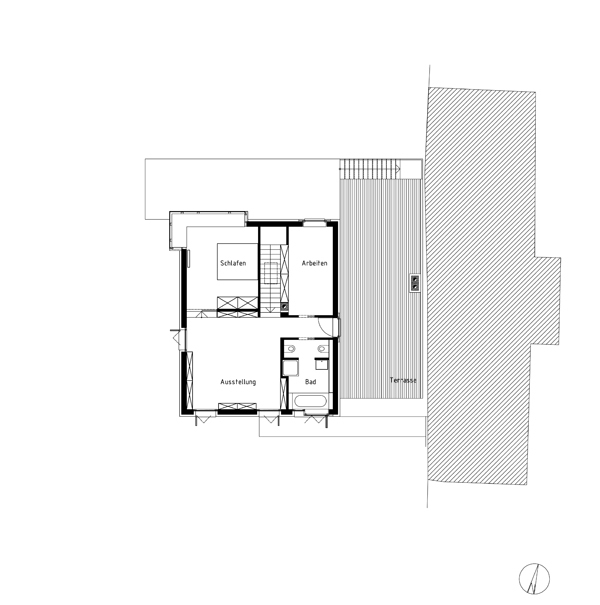 Das schlichte Gartenhaus für eine Sammlerin gliedert sich in den reichen Baumbestand ein. Als eine Art kleines Museum bietet der verzogene Kubus viel Stauraum und Präsentationsfläche. die unregelmäßig gesetzten Fenster transportieren die Idee der Vitrine und rahmen als Endpunkte der Weg- und Sichtachsen Ausblicke in den Garten. Ein Deckensprung erhöht den zum Garten orientierten Wohnraum, setzt sich im darüber liegenden Schlafzimmer (mit verglasten Übereck-Erker) fort und verformt den Kubus an dieser Stelle.