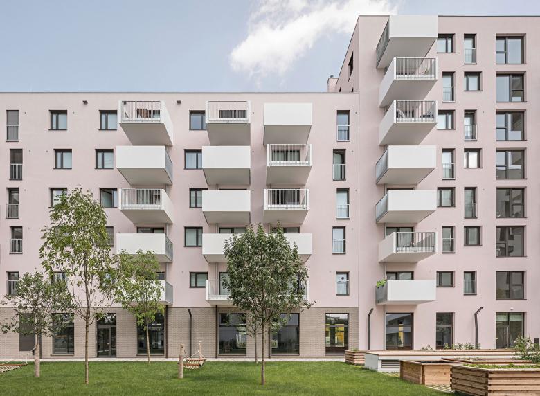 Mit einem dezenten farbigen Akzent betonen wir die Mitte der Gebäudezeile. Die ingesamt 52 geförderten Wohnungen sind mit großzügigen Balkonen in zwei Ausführungen ausgestattet. Eine Variante ist zu den Seiten hin einsichtig, die zweite nach vorne. Auf der Hofseite kombinieren wir beide Varianten, um unterschiedliche Aufenthaltsqualitäten und Nutzungsmöglicheiten zu schaffen. Straßenseitig kommt ausschließlich die weniger einsichtige Variante zum Einsatz.