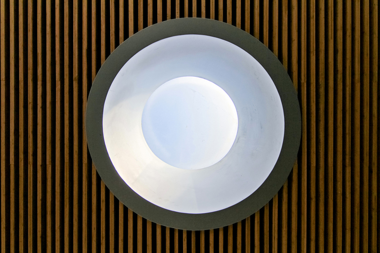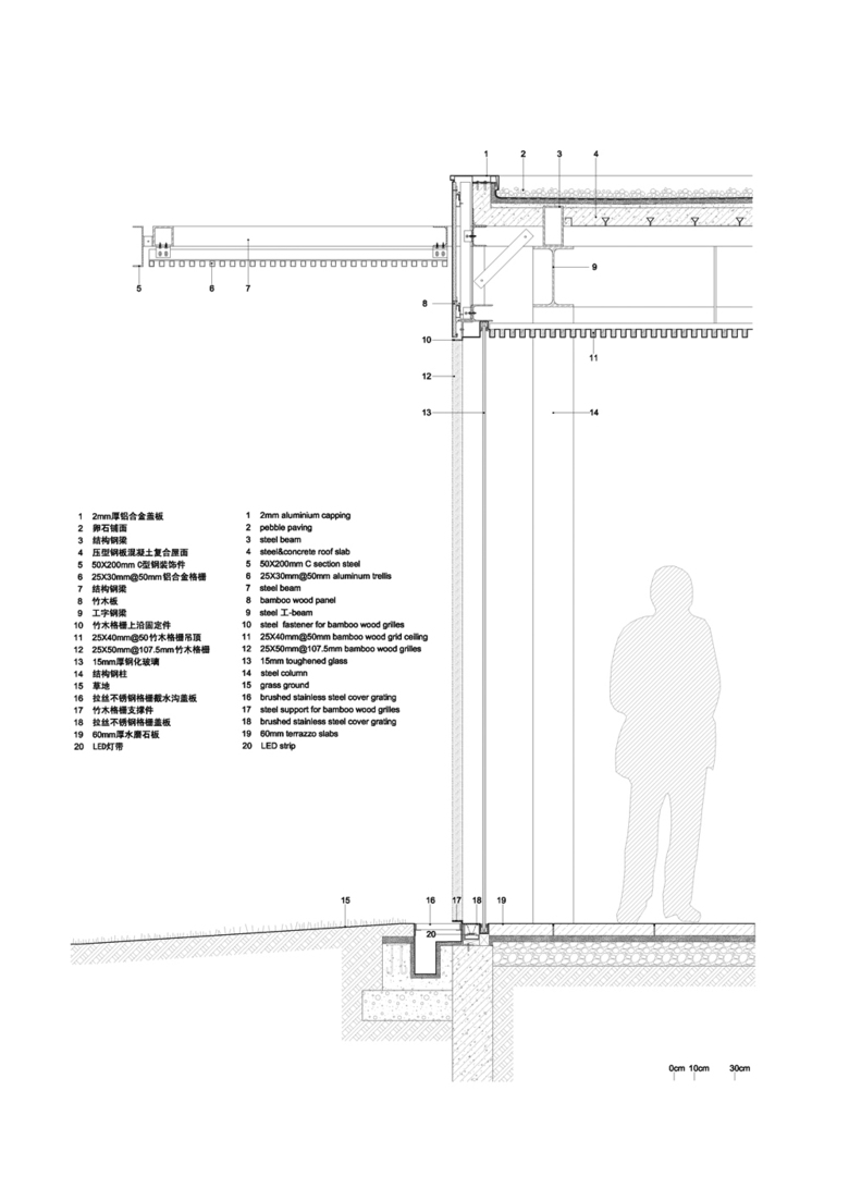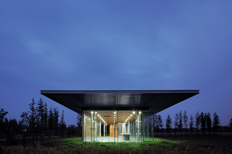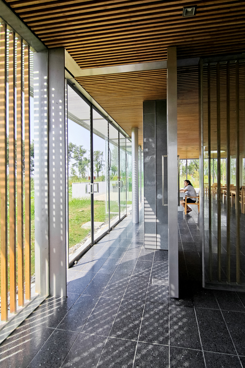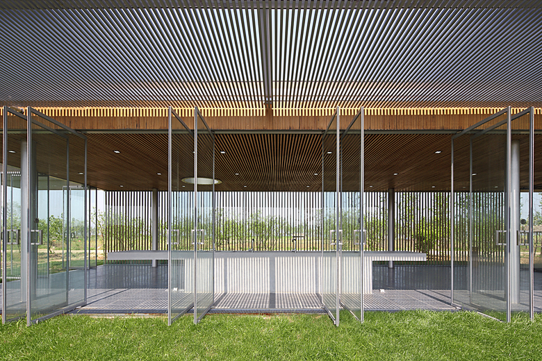 The harvest pavilion appears a simple, light, and translucent cuboid, with a horizontal thin plane hovering at the top, flying parallel with the horizon in the distance. The plane, made of pre-fabricated aluminum rods, cantilevers out at 4 sides at various depths. The space below becomes a transition zone from the interior to exterior, and promotes the potential activities because of the pleasant shadow casted by the canopy. The building façade system consists of vertical laminated bamboo louvers, floor-to-ceiling frameless glass panels, and pivoting glass doors, The transparency and lightness of such a material combination visually fuse the building volume with its surrounding landscape, and make the architecture sensitive to light. Under the condition of nice weather, when the pivoting glass doors are all rotated to open, the indoor space is literally stretched out into the farmland.