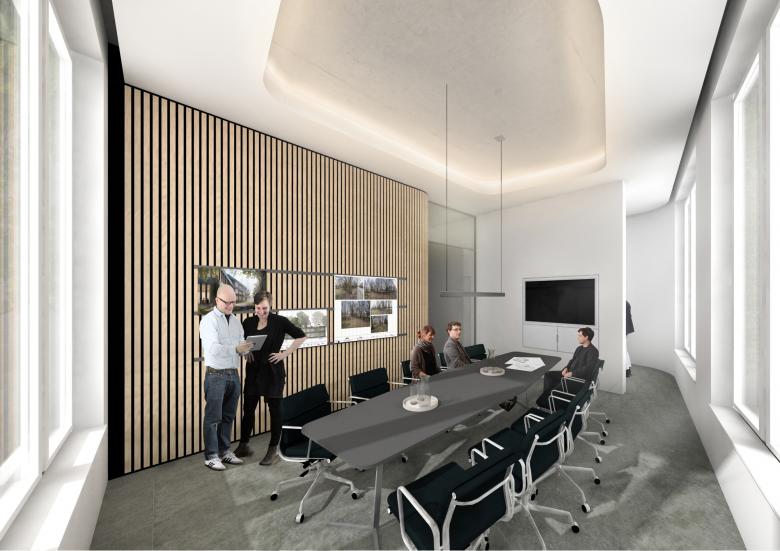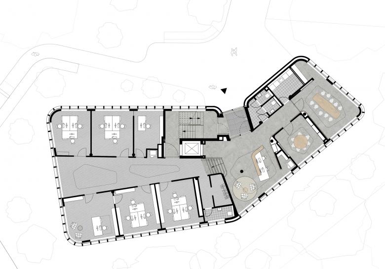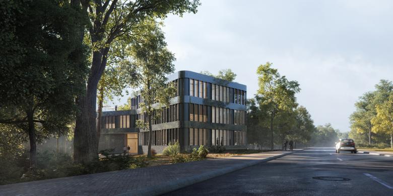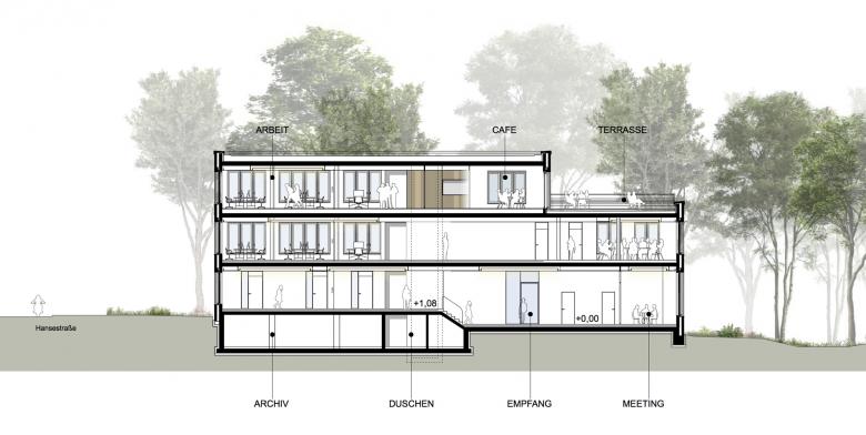 Der Charakter der natürlichen Grünfläche ist prägend für den Entwurf des Bürohauses. Das Gebäude wird zum „Haus auf der Lichtung“, eingebettet in einen Naturraum mit Waldcharakter.