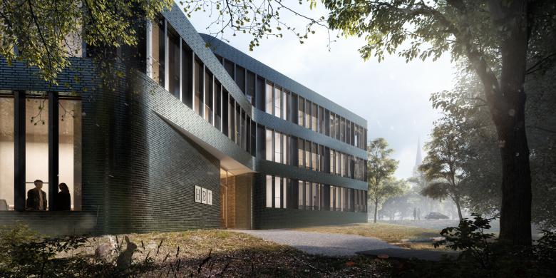 Der Entwurf präsentiert sich als klares Volumen, dunkelgrün glasierter Ziegel, der den atmosphärischen Reichtum der umgebenen Natur widerspiegelt, verschafft dem Gebäude die Wirkung eines markanten Solitärs. Gleichzeitig brechen die großzügigen Fensterflächen mit filigranen Fensterprofilen die Homogenität und geben dem Gebäude Leichtigkeit und Transluzenz. Als Grundform einem abgewinkelten Y ähnlich, formuliert das Gebäudevolumen eine Willkommens-Geste auf der Eingangsseite, während im Gebäude eine Blickachse auf den Kirchturm der St. Petri Kirche aufgebaut wird. Weiche Konturen mit abgerundeten Ecken verleihen dem Gebäude Bewegung und Dynamik.