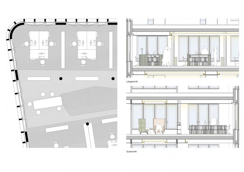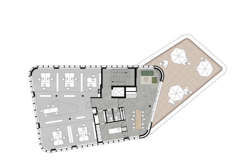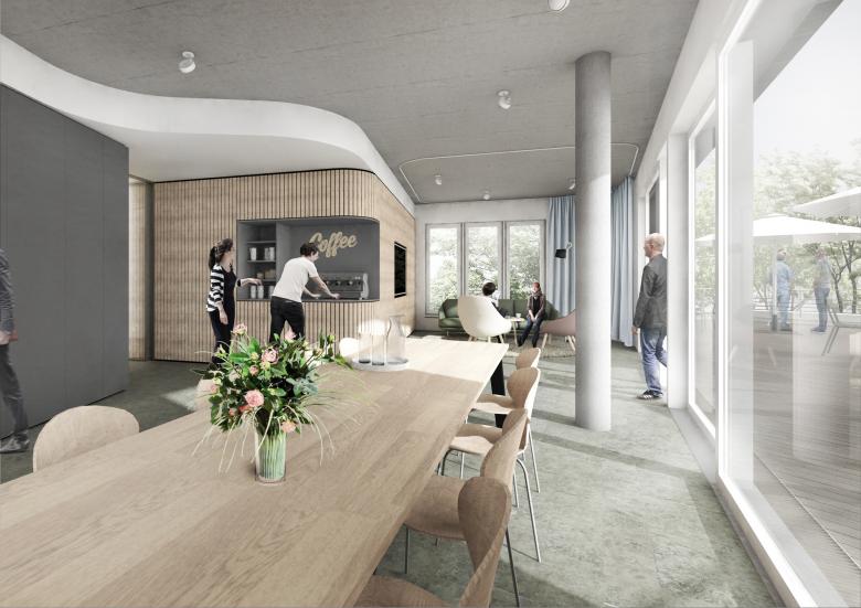 Abgerundet werden die Büroflächen um ein Café mit Lounge für die Mitarbeiter, das im zweiten Obergeschoss liegend eine fast 100 qm große, sonnige Terrasse mitten in den Baumkronen bietet.