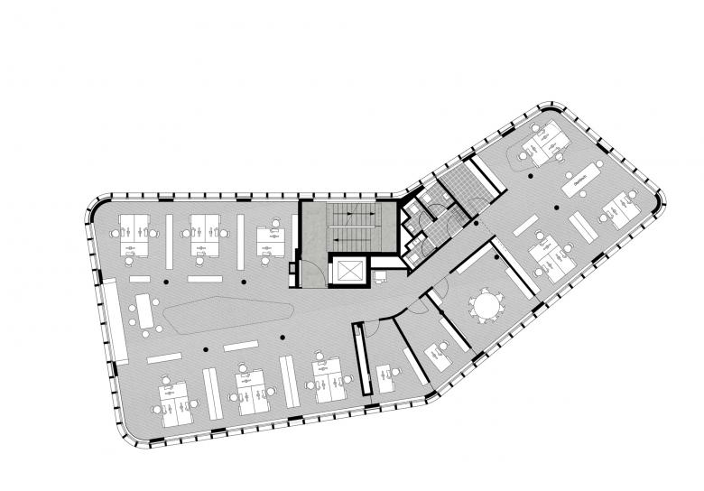 Die schon durch den Baukörper herausgearbeiteten dynamischen Innenräume werden durch Lichtvouten im Deckenbereich ergänzt. Lichtdurchflutete Räume mit Blick ins Grüne und auf die Altstadt von Buxtehude sorgen für außergewöhnliche Arbeitsplätze. Durch eine flexible Raumzonierung ist die Aufteilung von Zellenbüros bis zum OpenSpace-Office umsetzbar.