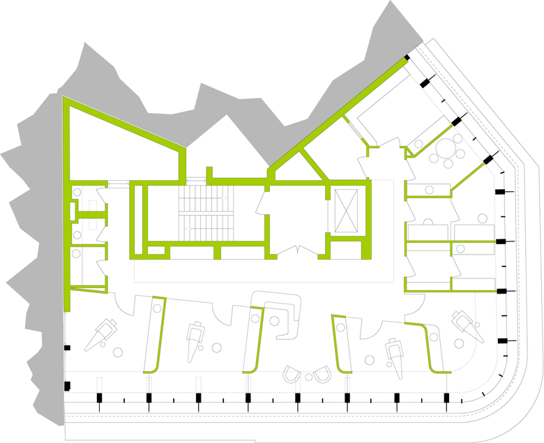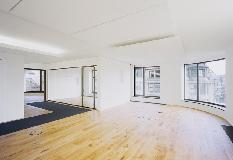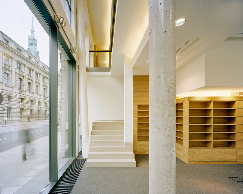 Das Gebäude verfügt über 6 Bürogeschosse sowie Basement, Erd- und Galeriegeschoss für zwei Ladennutzungen. Insgesamt wird in den Obergeschossen je Etage eine Büronutzung durch einen Aufzug und das Treppenhaus erschlossen. Der Treppenraum ist separiert vom Aufzugsvorraum angeordnet, sodass in allen Ebenen der Vorraum als individuelles Entrée fungiert und im Rahmen eines durchgängigen Designkonzeptes hochwertig gestaltet werden kann. Der Eingangsbereich im Erdgeschoss erhält eine lichte Höhe von ca. 7,00m und wird hochwertig ausgestattet. Die Büronutzungen sind durch einen lichten und offenen Grundriss geprägt und erlauben eine flexible Möblierung durch stützenfreie Räume und glatte Deckenuntersichten. In den Mietungen wird die gesamte Gebäudetiefe erlebbar, teilweise verglaste Trennwände zwischen Büros und Flur gewährleisten einen Durchblick auf die Handelskammer, den Adolphsplatz und Richtung Rathausmarkt. Die zentral angeordnete Versorgungseinheit enthält Nebenräume, wie Flächen für Server-, Kopierraum, Sanitäreinheiten und Pantry. Jede Nutzeinheit erhält einen Abstellraum innerhalb der Mietung.