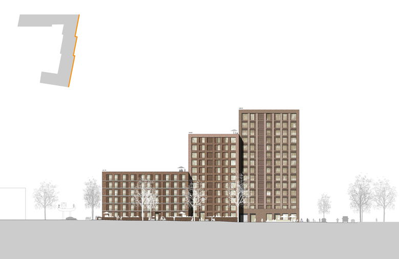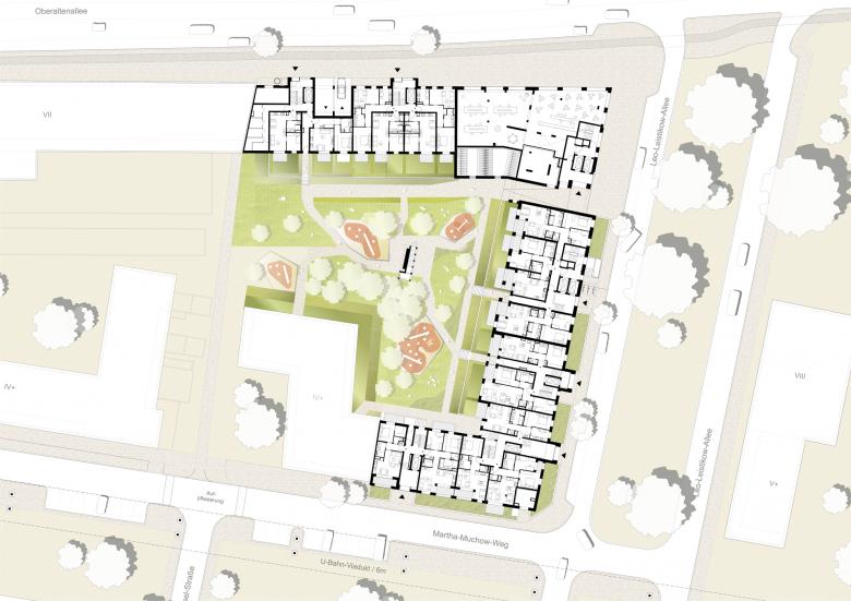 Die abgestimmte Planung sieht eine differenzierte Eckbebauung entlang der Oberaltenallee, der Leo-Leistikow-Allee und am Martha-Muchow-Weg mit einer Geschossigkeit von 6-12 Geschossen vor. Das Ensemble erhält im Nordwesten eine deutliche Betonung durch die Hochhäuser und durch einen spürbaren Rücksprung von der Grundstücksgrenze an der betonten Ecke Oberaltenallee/ Leo-Leistikow-Allee eine großzügige Eingangssituation für das gesamte neue Quartier der Finkenau.