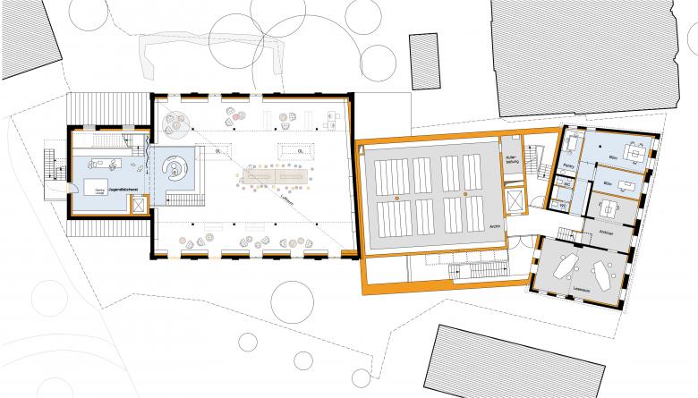 schaffen somit eine barrierefreie Verbindung auf allen Ebenen. Der gemeinsam genutzte Verwaltungsbereich von Stadtbücherei und Stadtarchiv befindet sich im Obergeschoss des Bestandsbaus zur alten Wache.