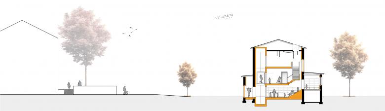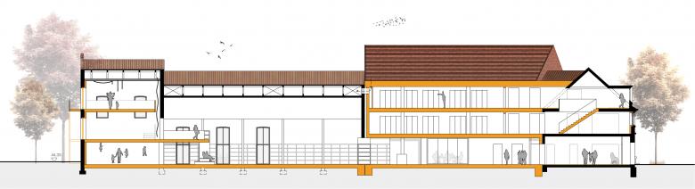 Der Saalbau wird in seiner grundsätzlichen räumlichen Struktur erhalten. Die Außenwände werden innenseitig neu gedämmt und erhalten umlaufende Bücherregale. Der überhöhte Teil des Saales wird frei gestaltet, er ist der neue Begegnungsraum und Treffpunkt der Stadtbücherei und steht flexibel für verschiedene Nutzungen wie z.B. Leseraum oder Veranstaltungsort zur Verfügung. Der alte Bühnenturm wird auf drei Ebenen bespielt und bietet Rückzugsorte zum Lesen und Lernen. Über einen neuen Aufzug, sind auch die Nutzungen im Turm barrierefrei erreichbar. Versetzte Treppenläufe erschließen die frei in den Turm eingehängten Ebenen, spannende schmale Lufträume ermöglichen geschossübergreifende Blickbeziehungen.