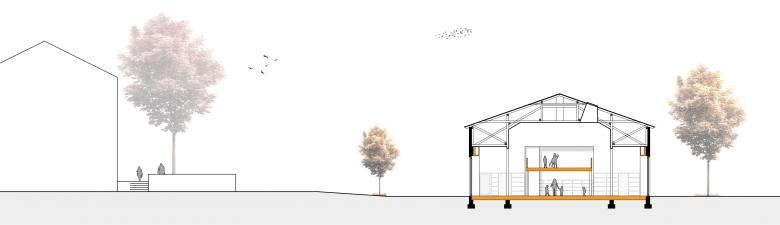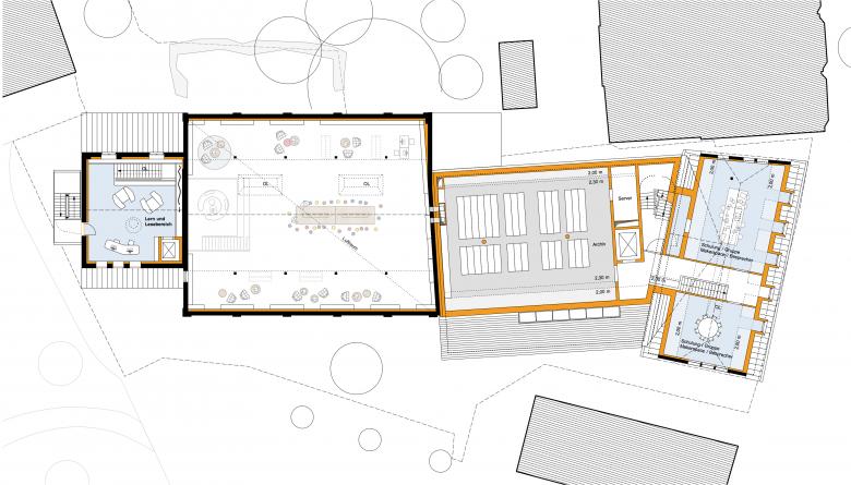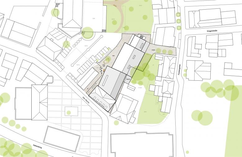 Die Bestandsgebäude bleiben in Ihrer Grundgestalt erhalten. Durch wenige, gezielt gesetzte neue Fensteröffnungen wird eine spannungsvolle Lichtführung mit neuen Ausblicken geplant. Oberlichter sorgen für eine helle Atmosphäre mit hohem Tageslichtanteil. Ein lichtdurchfluteter Saal als neues,