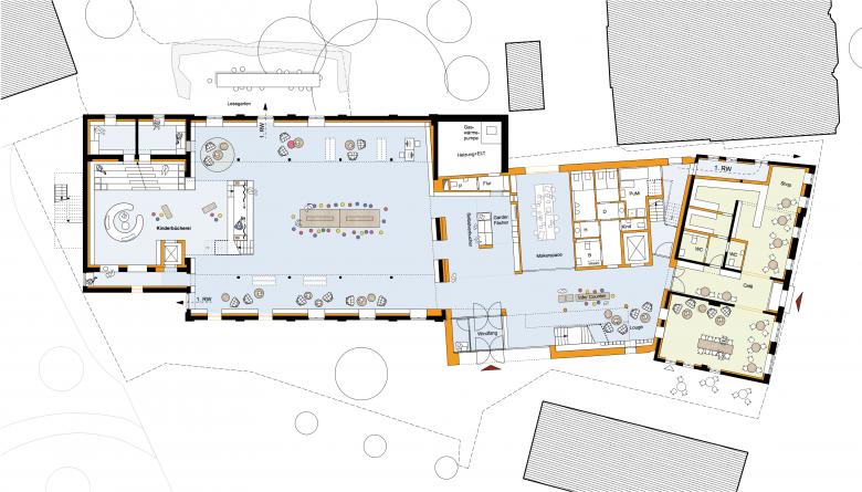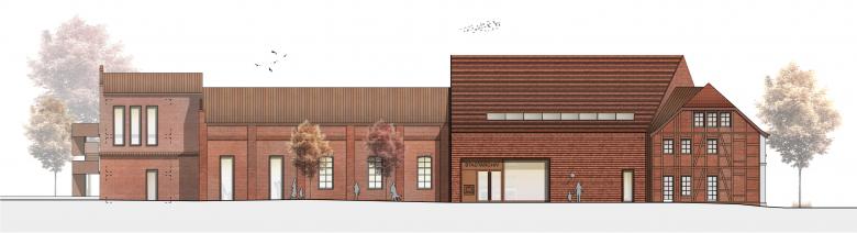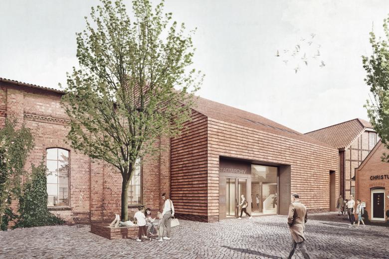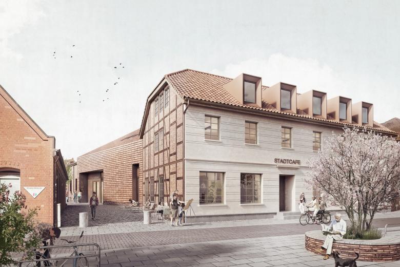 Zusätzlich bleibt der historische Eingang des Vorderhauses an der Alten Wache bestehen über den das Café erreicht wird. Neben dem separaten Eingang wird auch eine direkte Verbindung zur Bücherei vorgesehen. Die barrierefreie Erschließung erfolgt hier und zusätzlich über die westliche Twiete direkt in das Café. Die Geschosshöhen des Bestandes sind maßgeblich für den Neubau und
