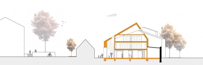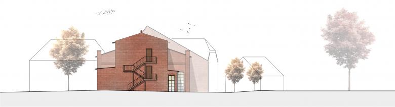 Das Saalgebäude sowie der Turm bleiben in Ihrer Außengestaltung weitestgehend erhalten. Neu gesetzte Öffnungen folgen dem Rhythmus der bestehenden Struktur und werden als bodentiefe Elemente neu in die Fassade geschnitten. Eingefasst durch einen Stahlrahmen erhalten Sie eine moderne Anmutung und sind somit als neue Einblicke in den Innenraum klar ablesbar. Die bestehenden Öffnungen bleiben in Ihren Abmessungen und vorhandenen Brüstungen erhalten. Die Dächer des Saal und Turmgebäudes fügen sich in Ihrer Farbgebung und durch den neu gewählten Rot-Braunton harmonisch in den Gesamtkontext ein.