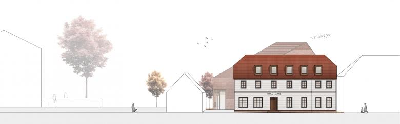 Der neue Baukörper fügt sich durch seine klare Kubatur und einem typischen geneigten Dach in den historischen Kontext ein. Durch Einsatz eines einheitlichen Materials von Dach und Fassade gehen diese beinahe ansatzlos ineinander über. In Anlehnung an den Bestand wird für den Neubau ebenfalls ein rotes Ziegelmaterial gewählt. Hier wird eine Ziegel-Schindel als Vorhangfassade eingesetzt, diese trägt das gleiche Grundmaterial in Anlehnung an das Saal- und Turmgebäudes und hebt sich dennoch durch eine Schuppenartige Anmutung ab und verleiht dem Bauwerk mit seiner repräsentativen Funktion als Haupteingang eine klare Haltung.
