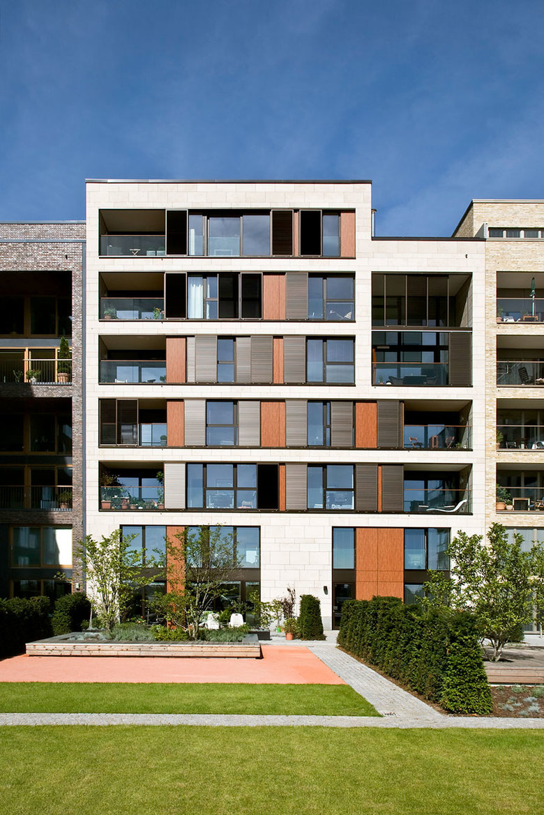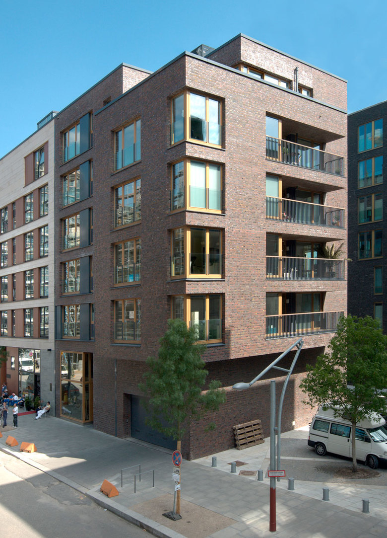 Am Kaiserkai 23-33 realisierten fünf Hamburger Wohnungsbau-Genossenschaften und die Viterra Development zusammen eine winkelförmige Baustruktur mit höchstem Wohngenuß an der Elbe. Ansatzpunkt des Entwurfs ist die Beschäftigung mit dem Thema „urbanes Wohnen“ und die Auseinandersetzung mit der historischen Typologie des Städtischen Reihenhauses. Davon abgeleitet entstanden sechs Häuser die in ihrer äußeren Erscheinung eine ausgeprägte Individualität aufweisen und ihre jeweiligen Besonderheiten unterstreichen. Unterschiedliche architektonische Handschriften entwickeln individuelle Häuser, lassen diese dann durch Maßstab, Materialaussage und Textur zu einer Familie verschmelzen. Es entsteht ein breit gefächertes Wohnungsangebot mit anspruchsvollen Grundrissen, durchdachter Innenraumgestaltung, großzügigen Loggien und Dachterrassen mit reizvollen Ausblicken. Der Hof versteht sich als Wohnhof, Wohnnutzungen auch im Erdgeschoss unterstützen dies.