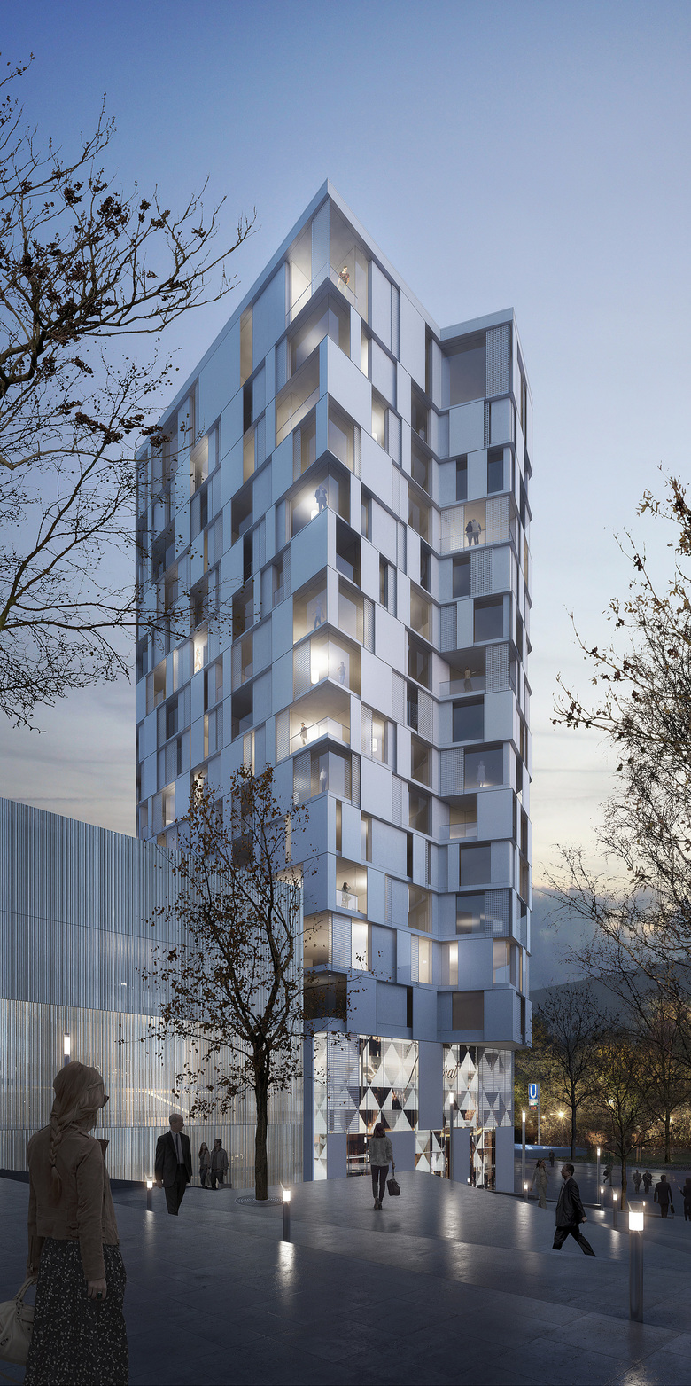 Um die verschiedenen Nutzungen und Freiräume in ein homogenes Gesamtvolumen einzubinden wird eine kleinteilige Fassadenstruktur gewählt. Eine mehrschichtige helle / weiße Fassade verleiht dem Baukörper Tiefe und eine individuelle Prägung. Die Wohnungen erhalten eine vorgelagerte Fassade als Sicht-und Sonnenschutz (brise soleil) und bieten durch die Perforierung der Fassadenelemente Transparenz und Schutz zugleich.