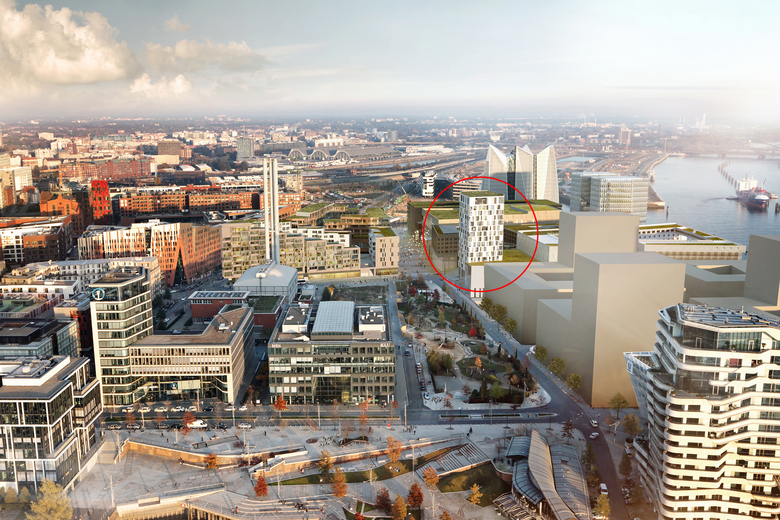 Der Turm setzt ein selbstbewußtes Zeichen mit einer ausgeprägten Individualität im Schnittpunkt der Quartiere STRANDKAI und ÜSQ.