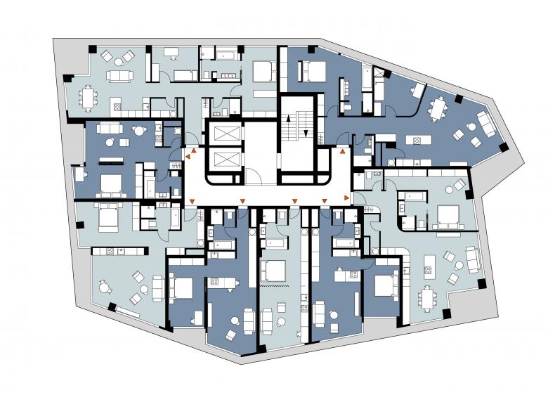 Das Gebäude setzt sich aus den zwei Bausteinen Retail / Mall und Wohnen zusammen. Durch ein statisches System mit einem zentralem Kern und tragenden Fassadenstützen ist maximale Flexibilität in der Grundrißgestaltung möglich. Für die Geschoßaufteilung ist eine Varianz zwischen kleinteiligem 6-Spänner und großzügigem exclusivem Penthouse möglich. Alle Wohnungen erhalten private nicht einsehbare Loggien.