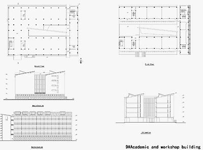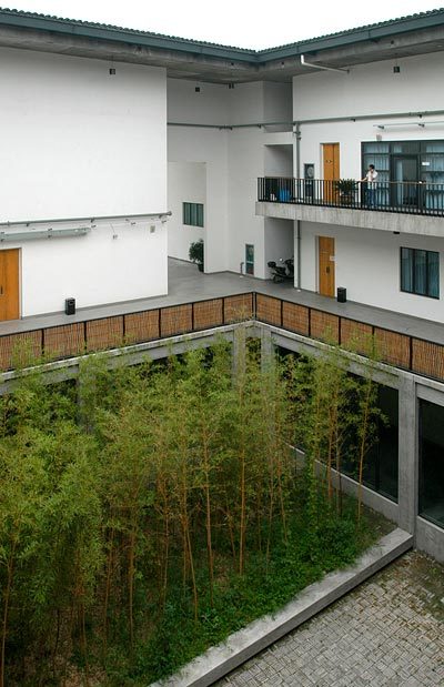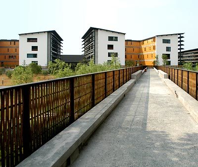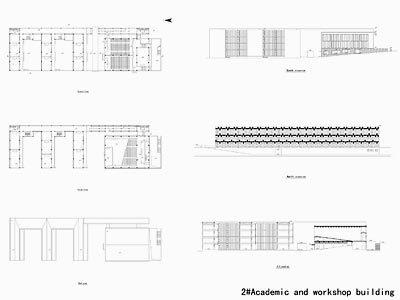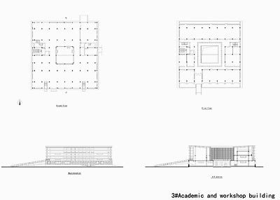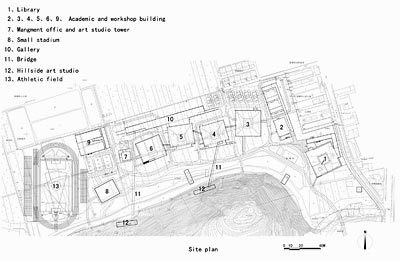 composed of ten buildings, including a library, a gallery, a small stadium, a workshop tower, six academic and workshop buildings, two traditional style bridges cross the river, two hillside art studio.
