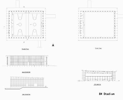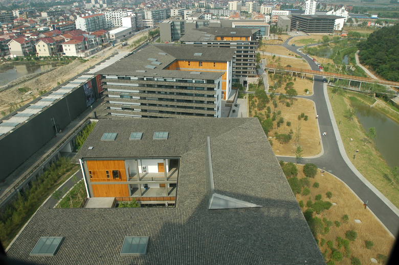 The design for this campus is considered as a start of a reform. The choice of themes is directed by traditional construction culture and its continuation: Garden making, construction, differentiation, material recycling and reuse. The Chinese character of “ ªÿ” [enclose] is the theme of the series, which forms the layout of “ ”™“ [create, compose, shape, form, construct]. In fact, the simple “court” of traditional China can be made to accommodate nearly all functions. What is attempted here is a “court”-based free typology, related to both, the tradition and more importantly, the gigantic space and functional requirement of this building. In the character of “ ªÿ” building and nature occupy half of the space. As the sloping, twisting, and turning occurs on the site, the building twists and transforms accordingly, thus addresses uniformity and variation at the same time. The inevitable bulk of the buildings are purposefully lowered, horizontal sunscreen slope emphasizes the horizontal extension of the corresponding mountain range. The base of the handicraft-school is made with stone by a local method, traditionally used in the local tea field construction. This is a symbolic gesture representing the rooting of the school in the surrounding. An important aspect of the design is the “free” concept. This “free” concept is not just about its architectural forms, but its sensitive response to the nature. The structures are usually similar or identical to each other, but its variations are created by the relationship with the site. The basic architectural types are sensible to fast and large scale constructions. At the same time, changes in design are frequent and spontaneous during construction process. This provides a platform from where architects and artists will participate in the process to “build”. A large collection of over two millions pieces of tiles of different ages and sizes, salvaged from the traditional houses demolished all over the province of Zhejiang, will cover the roofs of the campus architecture. In sharp contrast to the fast and mass construction concept of today, the concept seeks to embody another philosophy.