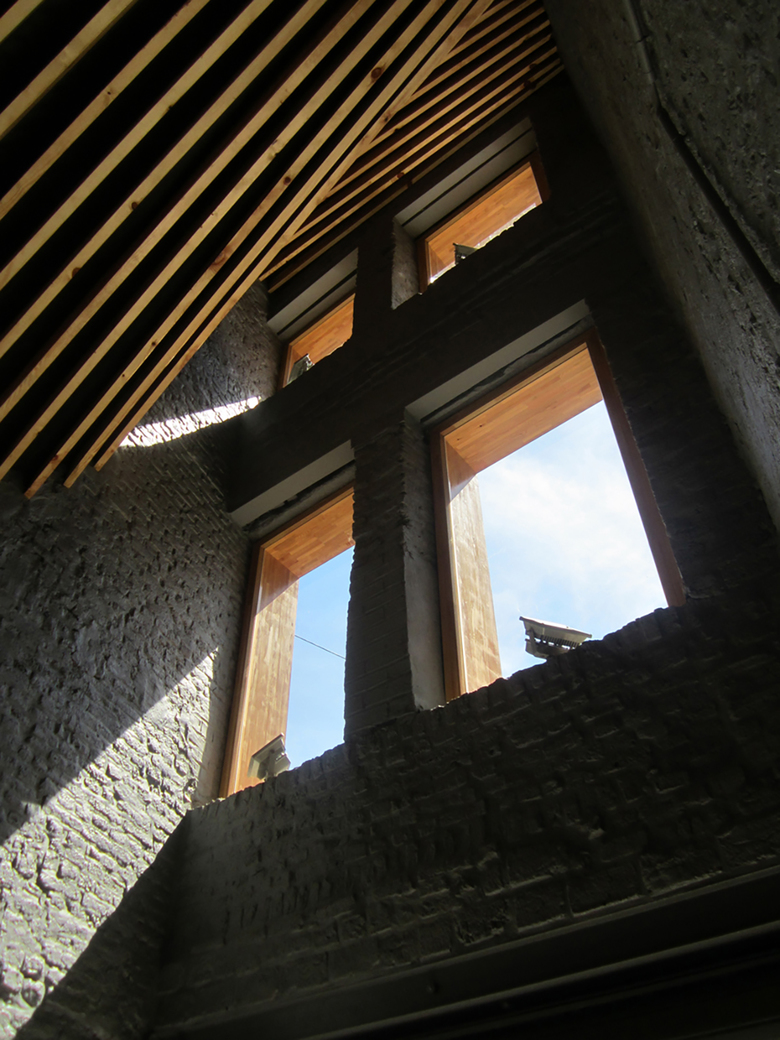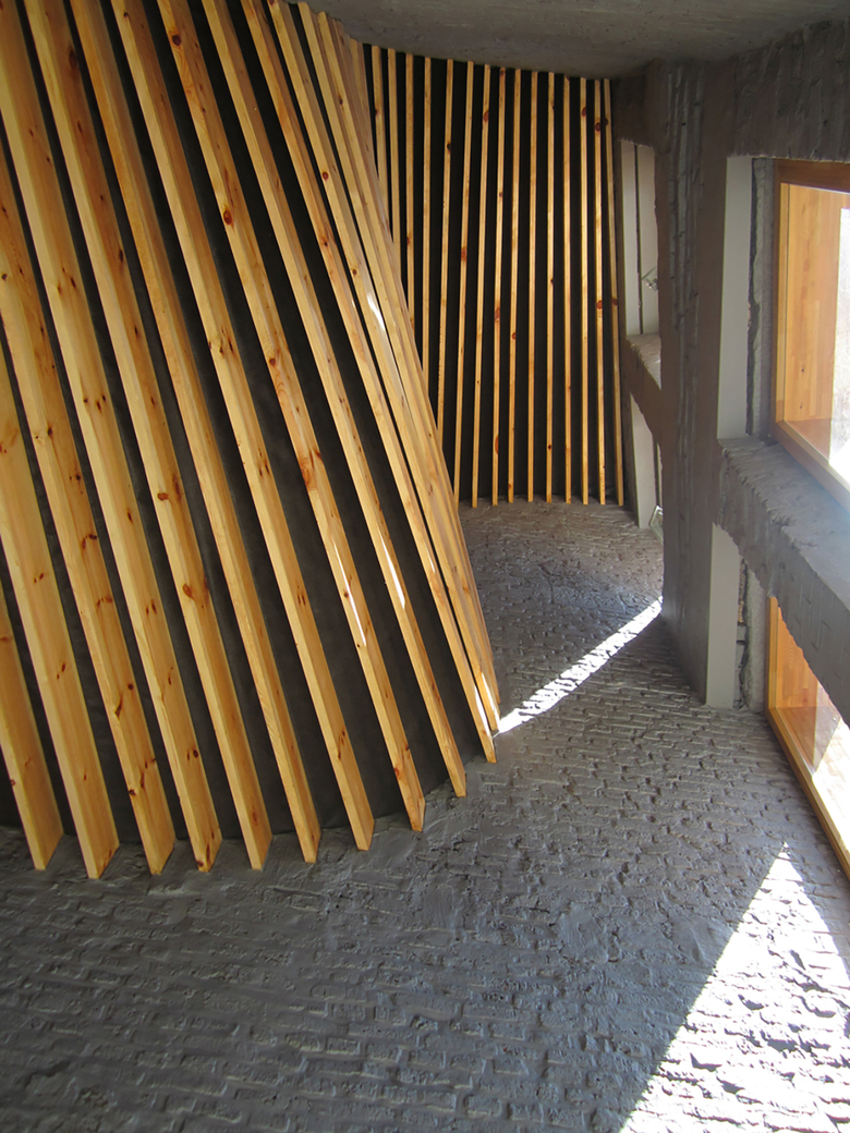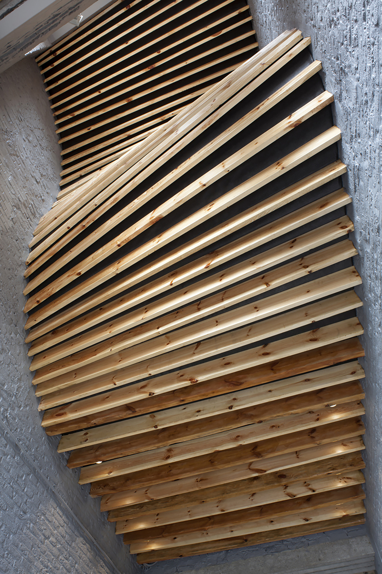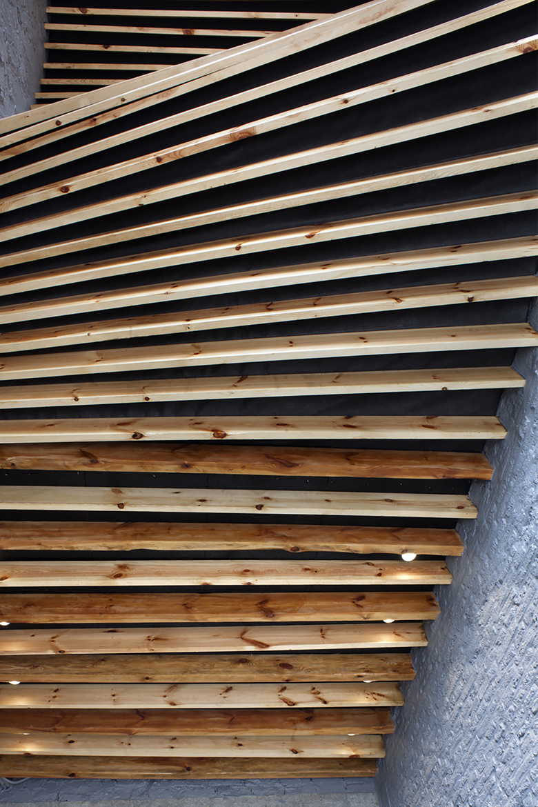 Inside the building, we demolished a part of the ceiling to create a skylight that goes through the entire building. This skylight is completely covered with a wooden structure in order to design a dynamic space created by curves and counter-curves.