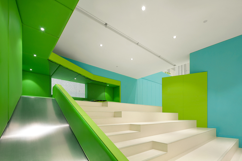 Breaking from traditional educational layouts, the smart volumes are filled with a variety of elements to engage children with playing and learning. Containing slides, climbing zones, soft-upholstered seating and other elements.