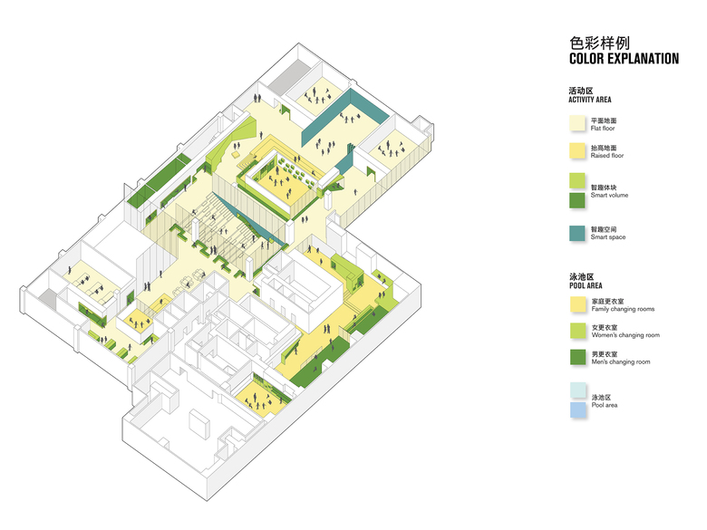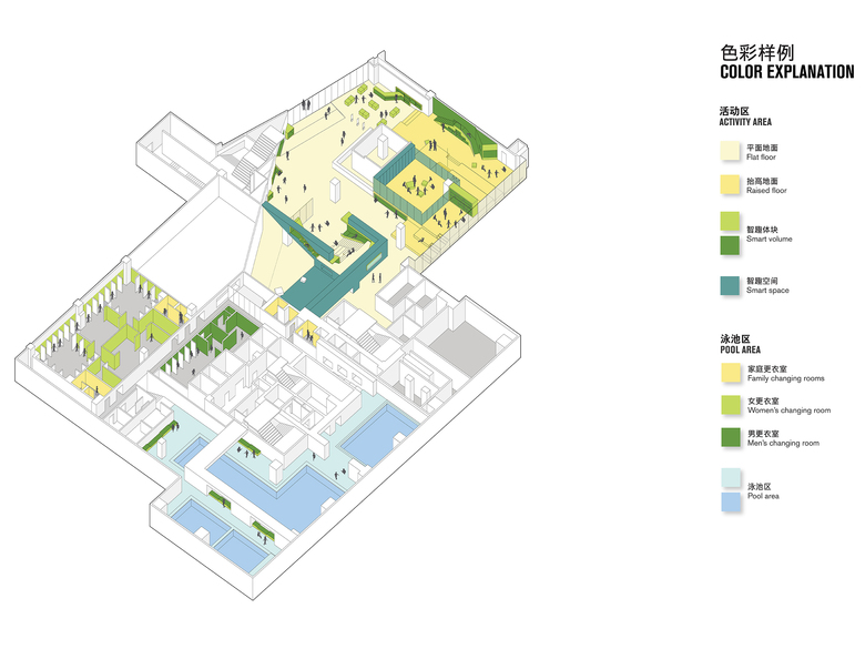 Yellow, blue and green represent the city of Qingdao. Each color is indicating a special design feature. Recognizable for children, active floors are in yellow, multi-functional smart spaces in blue and walls are transformed into green smart volumes. This allows for maximization of the amount of program in the available space.