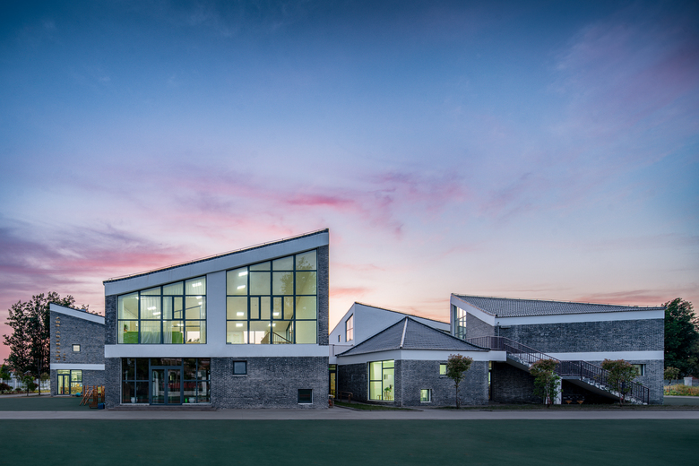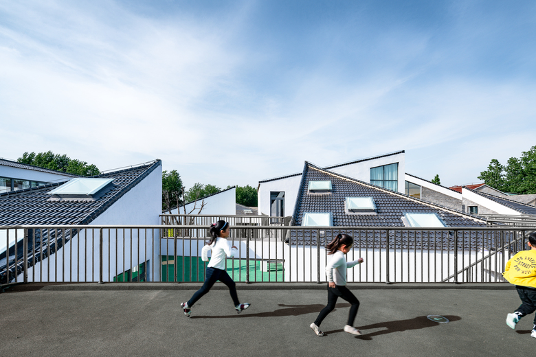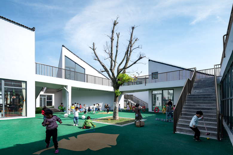 This Beisha kindergarten functions as a smaller, slightly modified version of village, of which the scale gives the children a sense of familiarity and the interesting building relationships introduce novelty and encourage curiosity. Entering into the gate, children would first discover the main central space and the overall “settlement” surrounded by the trees and then, as they meander in between the “houses” they discover small, secret places tucked away from the main square, perfect for outdoor learning activities and playing Hide-and-Seek, just like what they always do in the villages.