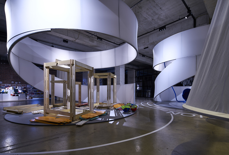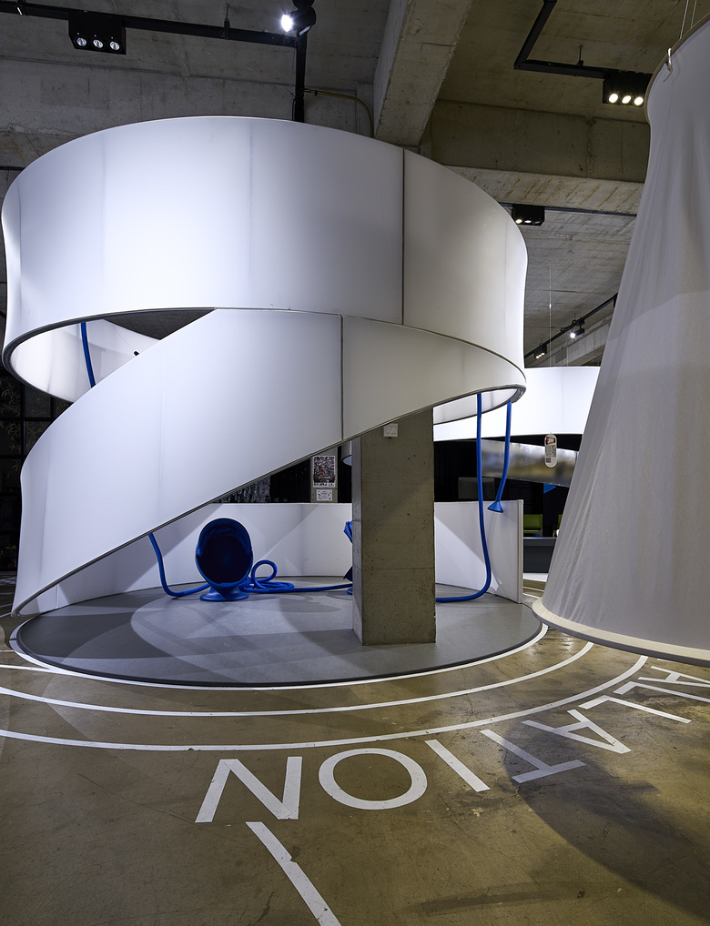A pure white ribbon drew visitors in the space with spiral-like movements, changing directions it turned into a path forming a succession of activities, games and discoveries at each step. Out of the path, the ribbon re-emerged in key moments, sometimes becoming backdrop for art, other times defining partitions for functional areas.