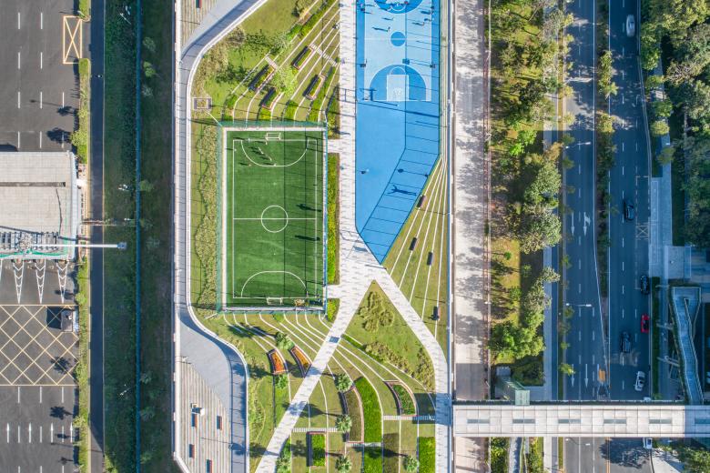 The segmentation of the long, stretched sports park was influenced by the adjacent educational institutions. Ultimately, the architects divided the rooftop stretch into 5 segments: the northernmost part is dedicated to the Shenzhen Nanshan Foreign Language School, followed by the Professional Sports Competition and Training zone. Next are the facilities for Shenzhen Bay School’s North and South Campuses, and finally there is an area dedicated to the general public for leisure, fitness, and the enjoyment of greenery. In a functional sense, the strip satisfies the needs of multiple user groups for sport and leisure facilitation, becoming a linear recreation hub serving the neighborhood.