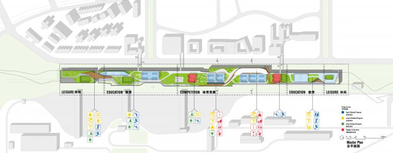 Crossboundaries proposed to subdivide the plot into 3 programmatic zones for the 3 different user groups, all of which tightly link with their immediate surroundings: one for the general public, for social & cultural interaction; one exclusively for use of by the adjacent schools, fulfilling educational functions; and one for professional sports, for training activities and hosting of competitions with an audience.