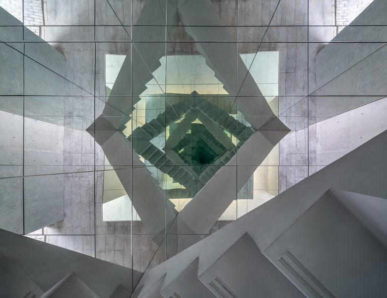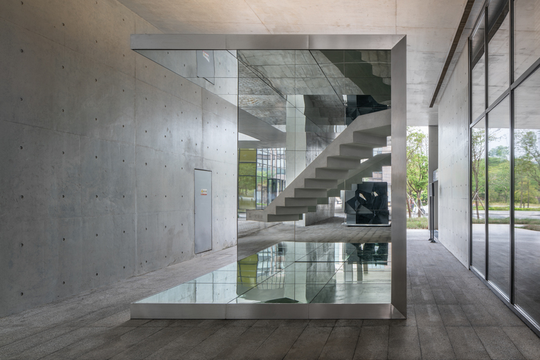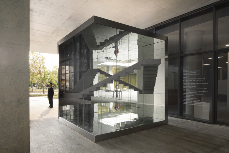 The work highly abstracts and refines urban materials - concrete, steel and glass - to form a cycled mirroring image. In a semi-open room enclosed by four mirror plains, a concrete stair is hung upside down, a prefabricated element produced in a factory, symbolizing modern industrial achievements like prefabricated construction that can accelerate the constructions on buildings and the growth of our cities.