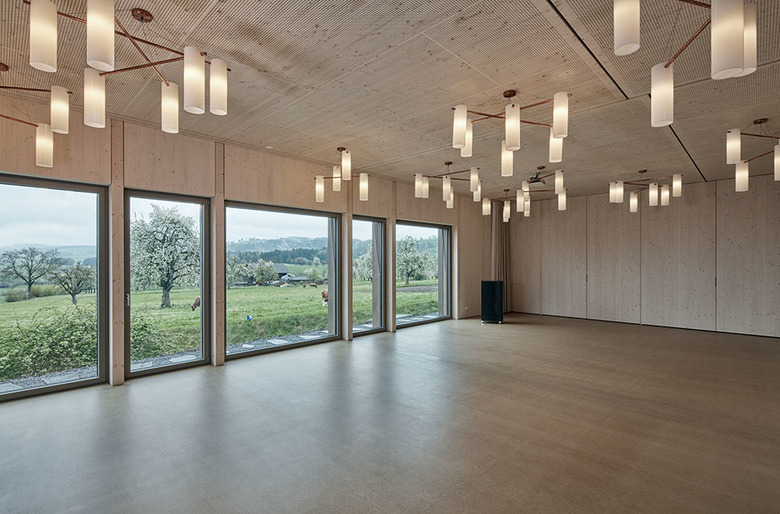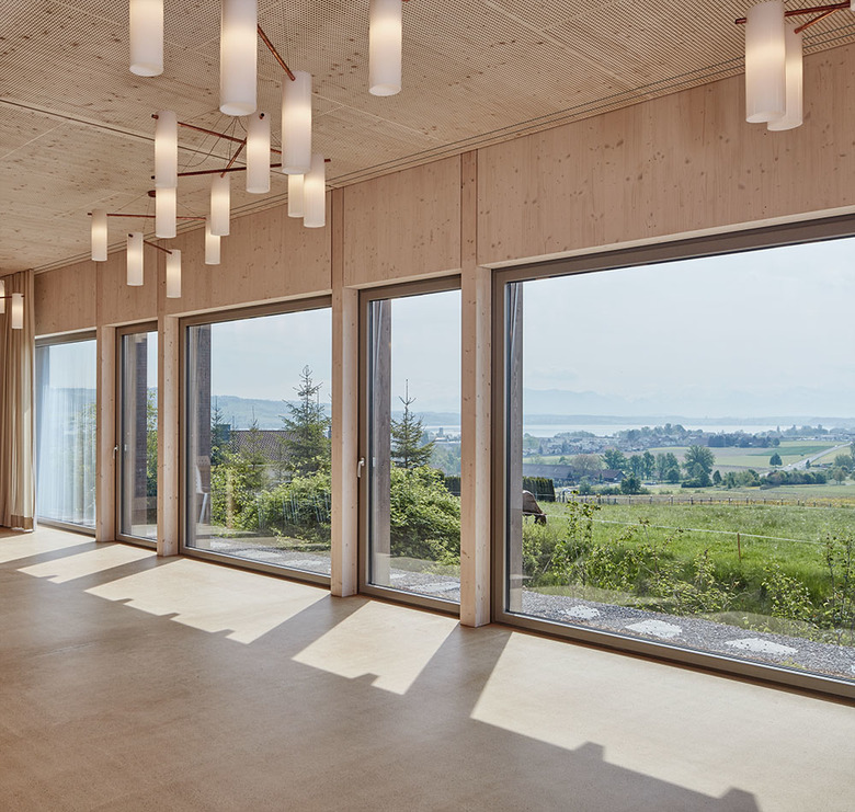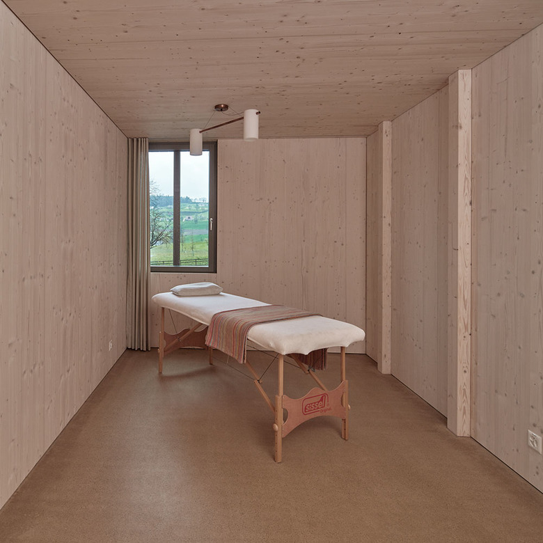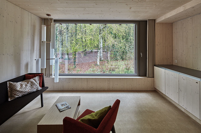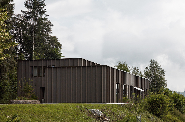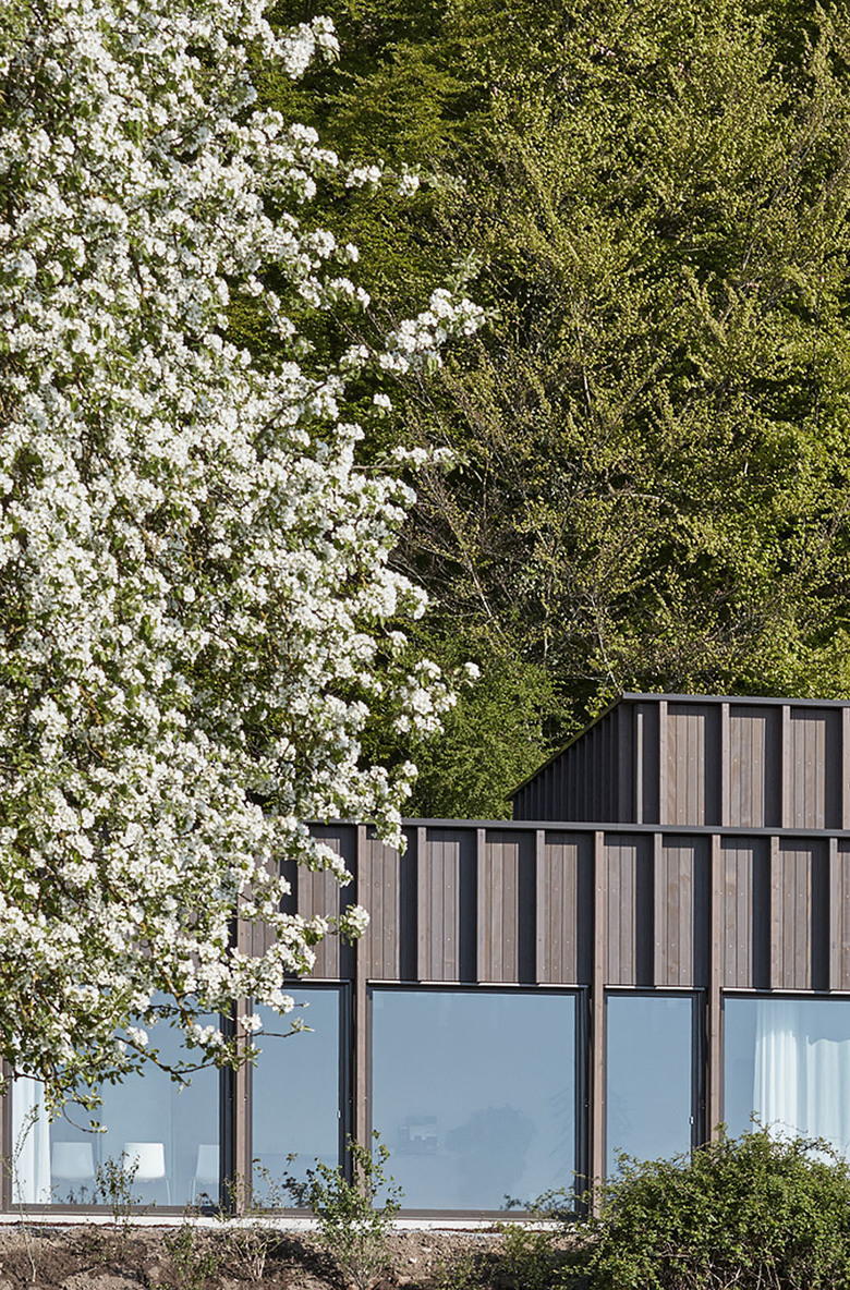 Das Besondere an der Bauaufgabe war der Wunsch der Bauherrschaft, das Geburtshaus nicht als medizinisches Gebäude, sondern als Wohngebäude in Erscheinung treten zu lassen. Es steht auf einer Erhöhung direkt am Waldrand, von wo man die Sicht auf den Sempachersee sowie das Bergpanorama geniesst. Zwei zueinander versetzte Gebäudekörper schliessen an den Bestand an und generieren zum Waldrand hin einen definierten Aussenraum. Dieser Vorplatz bildet die Adresse des Geburtshauses. Im Erdgeschoss sind die halböffentlichen Nutzungen wie Schulungs- und Aufenthaltsräume und die Geburtsabteilung untergebracht. Der zentrale grosszügige Eingangsbereich gewährleistet kurze Abläufe und Übersicht. Im Obergeschoss werden die Wochenbettzimmer und die Therapie- und Praxiszimmer angeordnet. Der ganze Bau musste innerhalb von sechs Monaten realisiert werden, wodurch man einen Holzelementbau auf einem Betonsockel entwickelt hat. Verbunden mit dem Nachhaltigkeitsgedanken der Bauherrschaft war die Holzbauweise das geeignete Material für diese Aufgabe. Die vertikale Fassadengliederung sowie die dunkle Farbbehandlung des Holzes verschmelzen mit der Farb- und Lichtstimmung des Waldes. Als Gegensatz dazu sind die Innenräume mit hellem Fichtenholz ausgekleidet. Das Beleuchtungskonzept von Christian Deuber verleiht den Innenräumen eine wohnliche Stimmung.