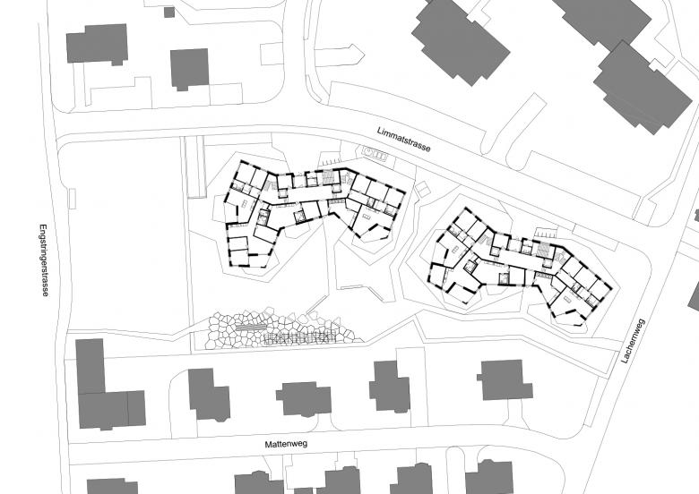 Das Grundstück befindet sich im Gebiet Lacheren am nördlichen Rand der Stadt Schlieren. Das Quartier ist geprägt durch zwei- bis dreigeschossige Wohnbauten. Die beiden Ersatzneubauten für 35 Wohnungen integrieren sich in die vorgefunden Körnung des Quartiers und gliedern sich harmonisch in die bestehende nördliche Bebauung ein. Aufgrund der städtebaulichen Setzung hat fast jede Wohnung zwei Seiten mit maximal unterschiedlichem Charakter: einerseits der stark strukturierte, härtere Rücken zur Limmatstrasse, andererseits die ruhige Seite zum Hofraum. Das Raumgefüge löst sich mittels Wandscheiben geometrisch in freie Formen auf, während die Individualzimmer rechtwinklig und statisch bleiben. Der architektonische Ausdruck des Gebäudes manifestiert sich in der Dualität der Fassaden: Die Strassenfassade ist im Kompaktsystem mit durchlaufenden Bändern ausgeführt. Durch die leicht goldig schimmernden Glasstreifen entsteht ein subtiles Spiel mit klassischen Themen der horizontalen Fassadengliederung. Analog zu den horizontalen Elementen auf der Nordseite sind die vertikalen Gliederungselemente mit goldenem Flies hinterlegten Scheiben materialisiert. Diese dienen einerseits der solaren Energiegewinnung aber vor allem sind sie gestalterische Elemente, welche je Lichteinfall bei jeder Tages und Jahreszeit den Hof in andere Stimmungen versetzen.