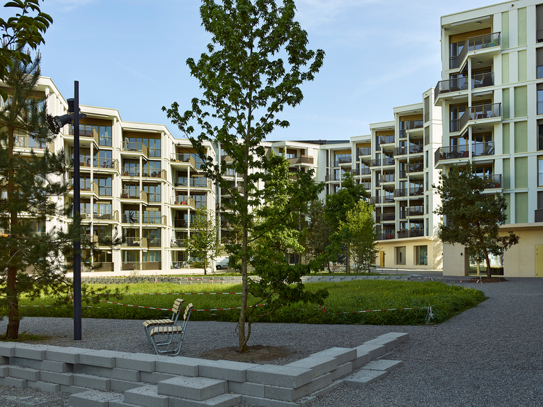 Die Lärmbelastung des Baufeldes wird zum Entwurfsgenerator: Zum lauten Äusseren minimieren wir die Abwicklung der drei Wohnneubauten, hier bringen wir öffentlichere Räume wie Küchen, überhohe Esszimmer und Treppenhäuser unter. Die Wohn- und Schlafräume orientieren sich hingegen zum Innenhof. Der Grundriss wird dabei so verdreht, dass frontale Einblicke in die gegenüberliegenden Wohnungen vermieden werden und ein Gefühl von Weite entsteht. Mit dieser Grundrissgestaltung werden auch eigentlich kleine Flächen als grosszügig empfunden.