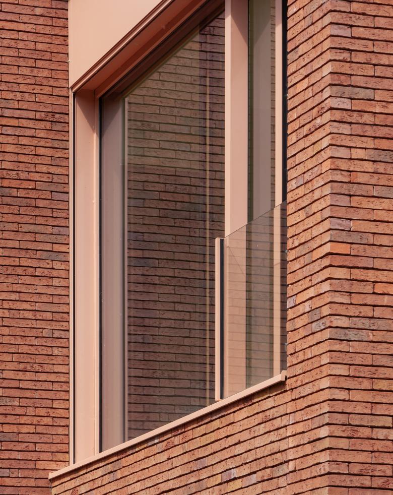 Ook de voorgevel manifesteert zich gesloten op het gelijkvloerse niveau om geborgenheid en privacy te bieden. Een patio naast de bureauruimte aan de straatzijde zorgt toch voor een rijke daglichtinval in deze werkruimte. De patiomuur begeleidt bezoekers naar de inkomhal. Ter hoogte van het hoofdgebouw is de muur opengewerkt en beidt zo een zichtlijn door het bureau.