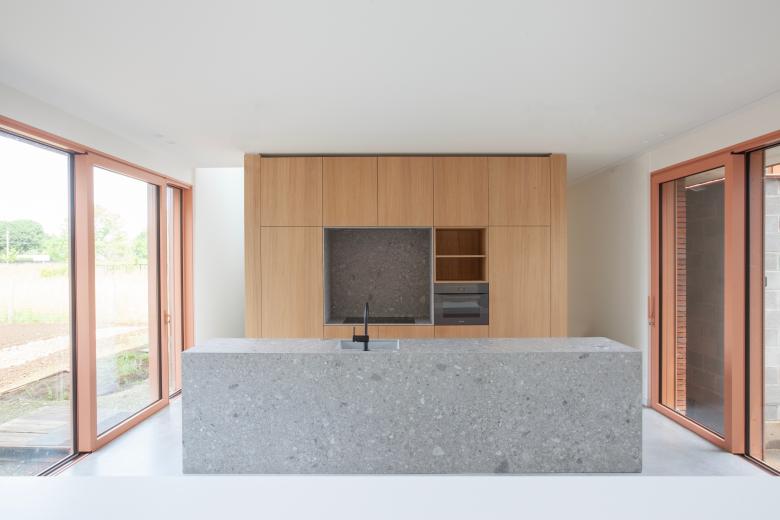 Het grondplan van dit ontwerp respecteert de schuine lijn van de linker perceelsgrens. Het nauwgezet volgen van die grens trekt de leefruimte open naar de achtertuin. De vrij gesloten gevel en een bijgebouw met een polyvalente ruimte verzekeren de nodige geborgenheid ten opzichte van de buur aan deze zijde van het perceel.
