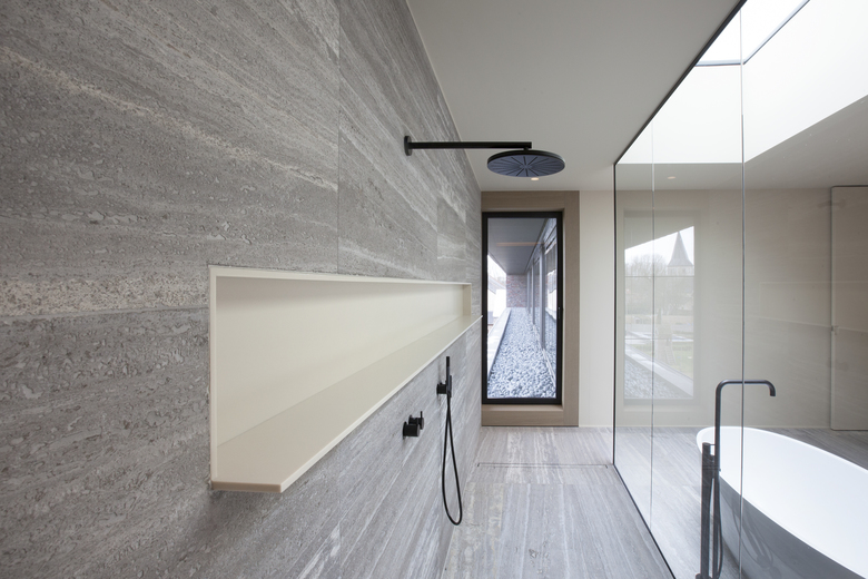 Een binnenpatio op de verdieping verlicht een kinderkamer, badkamer en de nachtgang. Een verdieping lager geeft een andere patio dynamiek aan de leefruimte en een polyvalente ruimte.