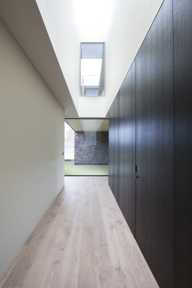 With a length of 33 meters, this house has an unusually elongated form, offering the opportunity to make a strong architectural statement: one end of the home cantilevers 8 meters. The brickwork gains a unique character through the relief and texture of the façade.